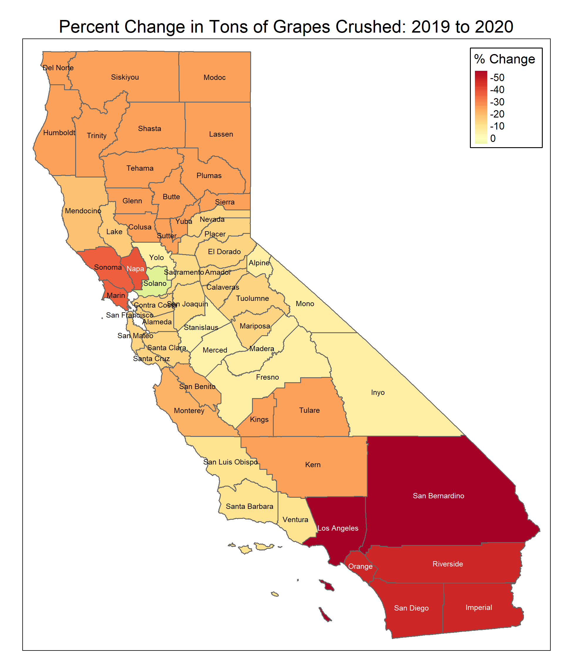 In 2020, quantities declined everywhere except the Solano District. The largest percent declines occurred in the Napa and Sonoma regions and in Southern California, which produces very little wine. The Napa crush was 39% below 2019 and Sonoma was down 36%.