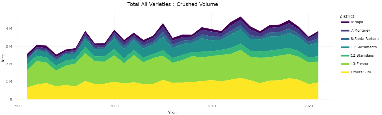 The Fresno and Sacramento districts are the largest wine-grape producers, followed by Monterey, Santa Barbara, and Stanislaus. California's most famous district, Napa, ranks ninth in production by volume.