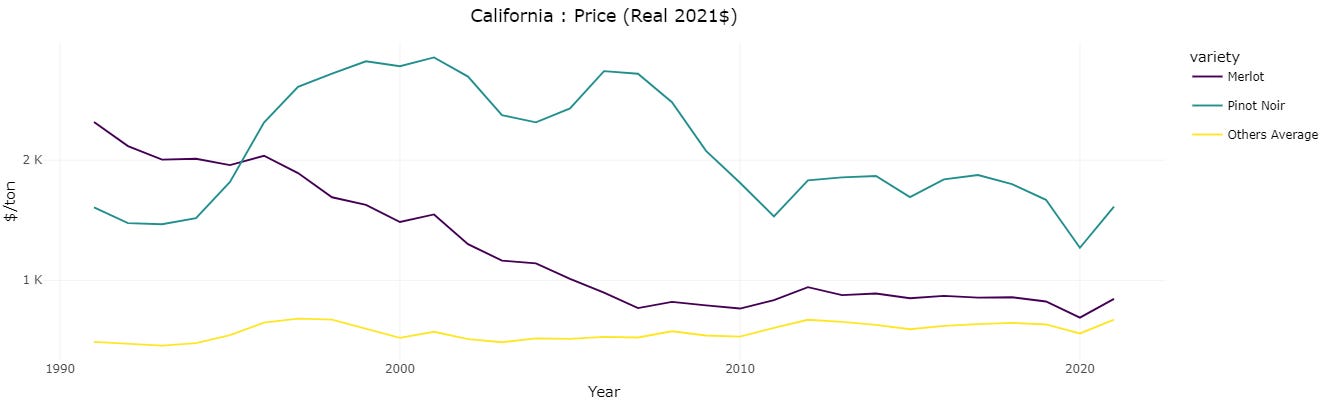The high price of Pinot Noir between 1997 and 2008 stands out in the above price graph. Many in the wine industry attribute the growing popularity of Pinot Noir, and the concurrent declining popularity of Merlot, to the 2004 movie Sideways. Pinot Noir prices did jump after the movie came out, but had also been high for several years prior to the movie. Merlot prices were in the middle of a decade-long price decline when the movie came out.