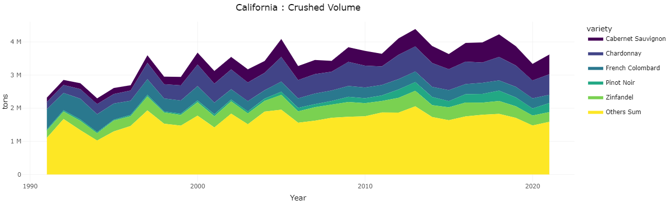 California wine grape production recovered somewhat in 2021 after a miserable 2020, but was still lower than any other year since 2008. The most produced varieties in 2021 were Chardonnay and Cabernet Sauvignon, each with about 600,000 tons of grapes, or about 400 million bottles of wine. The next three were Zinfandel, Pinot Noir, and French Colombard.
