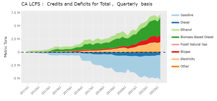 This dairy biogas earns LCFS credits because it is considered a low carbon fuel. The LCFS sets a target for the average carbon intensity of transportation fuels consumed in the state. Fuels that are more carbon intensive than the target accrue deficits that must be balanced by credits earned by fuels that are less carbon intensive. The figure below shows that gasoline and diesel producers generate deficits, which they can offset by buying credits from producers of biogas and other lower-GHG fuels like electricity and renewable diesel.