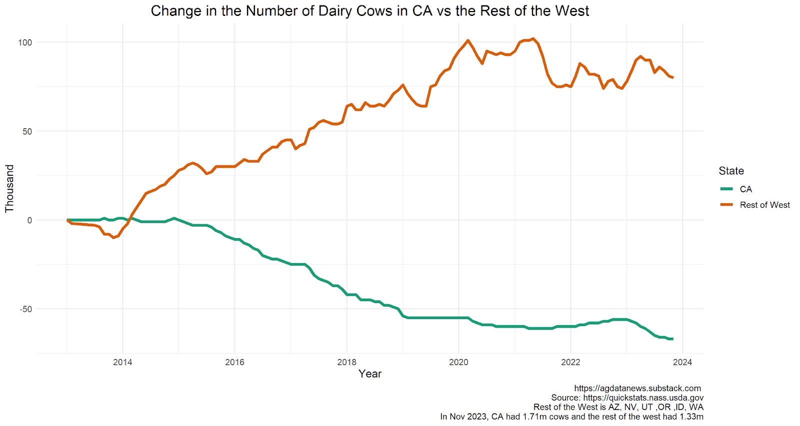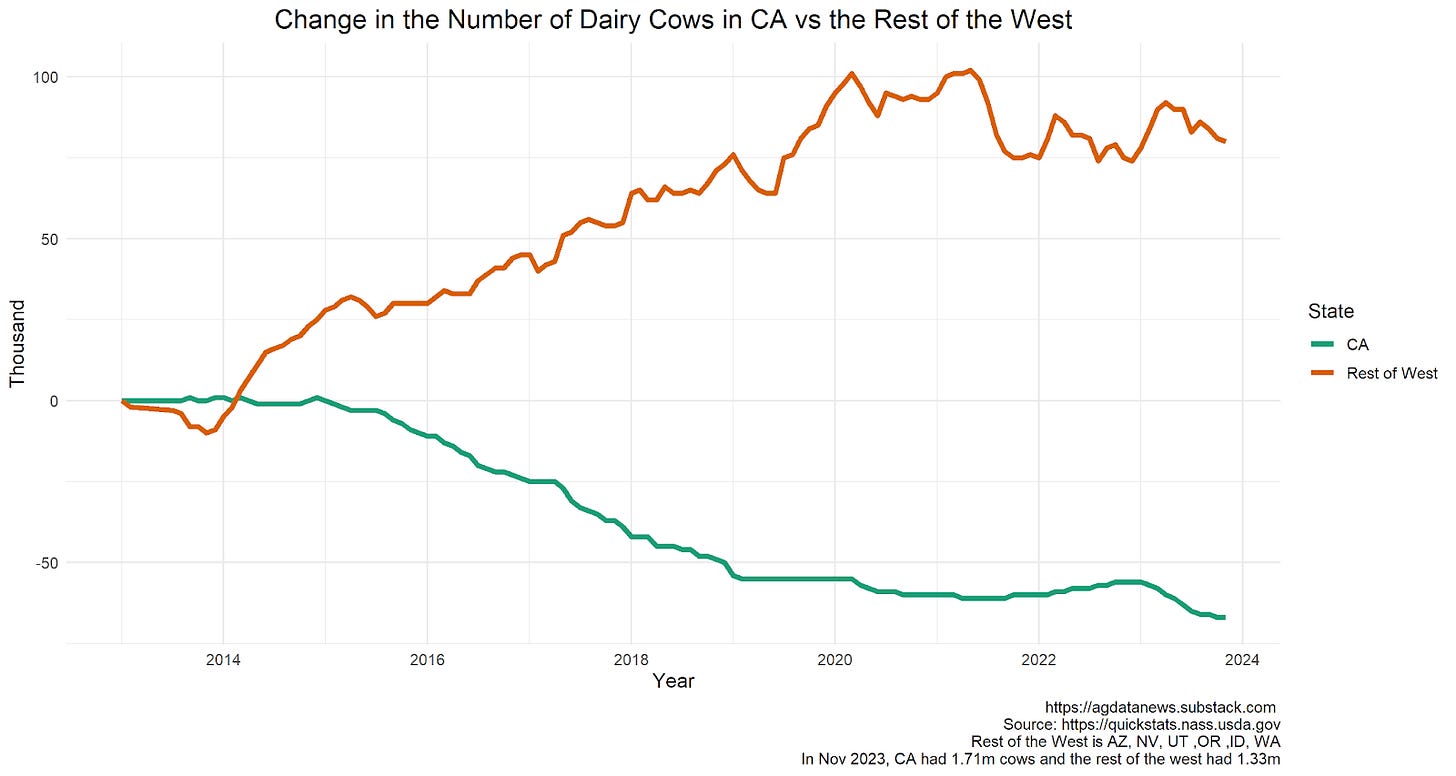 High profits from operating digesters create the incentive for farmers to expand dairy herds for the purpose of generating manure rather than for producing milk. Between 2014 and 2019, California dairy cow numbers declined by 50,000 while the number of cows in other western states increased by 100,000 (see figure below). Since 2019, cow numbers have been relatively flat throughout the west.