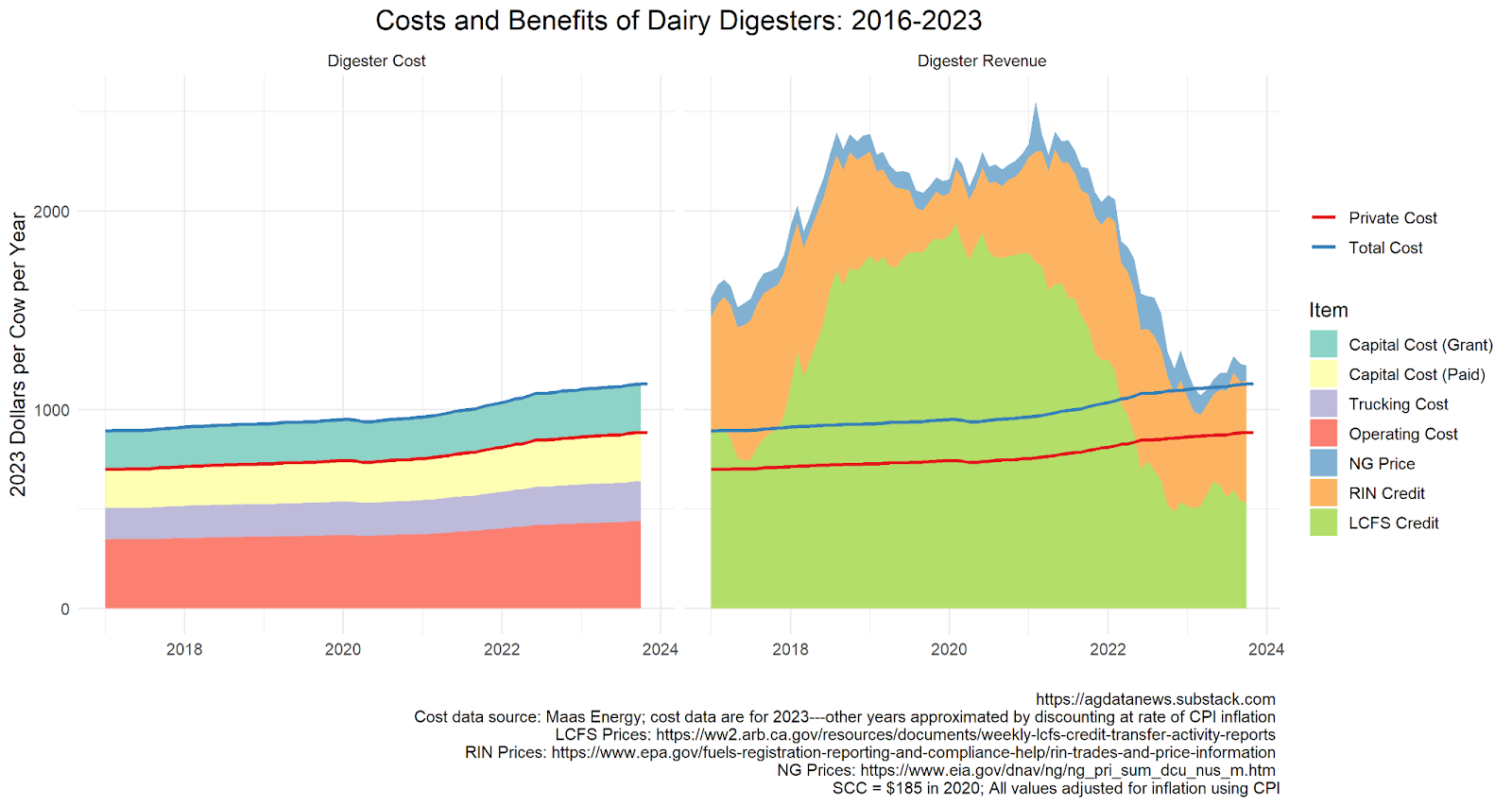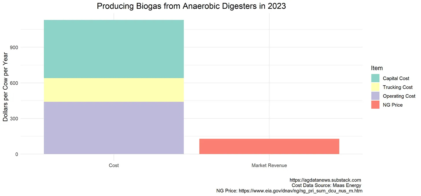 In this 2023 Ag Data News article, I showed that the cost of an anaerobic digester is about 10 times the market value of the gas it produces. A representative new digester costs about about $1130 per milking cow per year, comprising $490 in capital costs and $440 in operating costs, plus $200 in trucking costs if unable to connect directly to a gas pipeline. In 2023, revenue from selling gas was about $128, for a net cost of about $1000 per milking cow per year. This representative digester has a carbon intensity of -355, which corresponds to about 6 metric tons of CO2 equivalent emissions per milking cow per year.