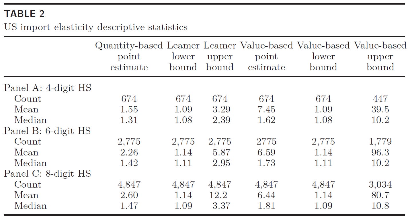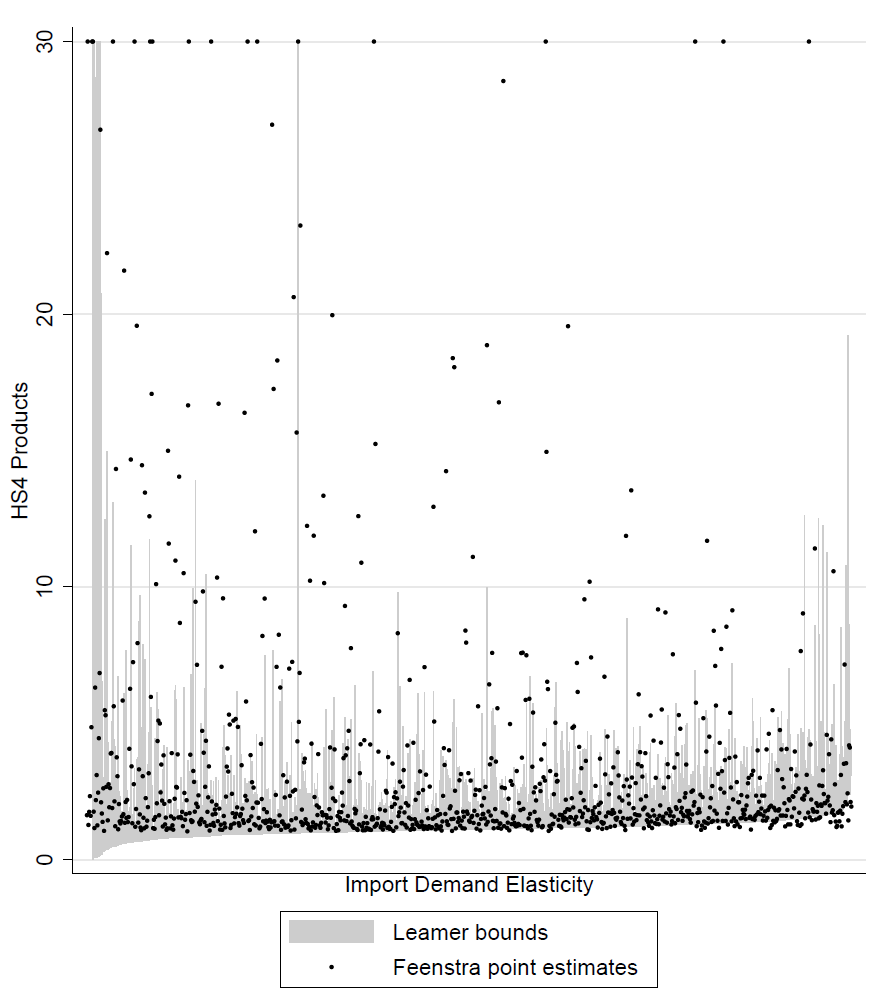 Here are import demand elasticity estimates for several hundred products defined at the "4-digit HS" level. For example, coffee is one of these products, so this classification is more granular than "beverage", but less specific than "decaffeinated". For most commodities, the elasticity ranges between 1 and 3, as indicated by the "Leamer Bounds" shaded region in the plot. The standard method, indicated by "Feenstra point estimates", typically produces elasticities above our estimated range.