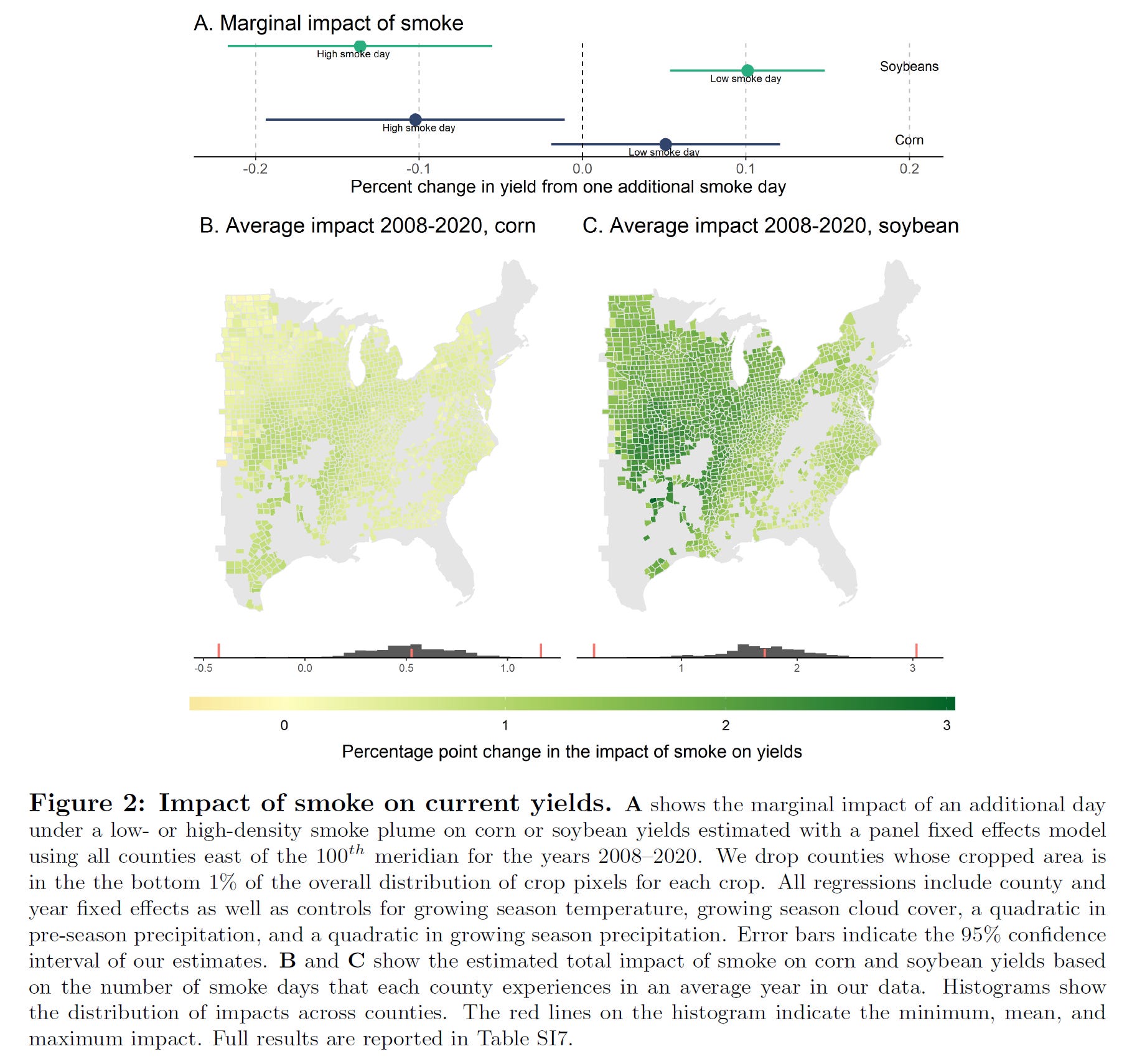 The average effects are moderate, but if heavy smoke were to sit over the cornbelt, it would noticeably decrease yield.