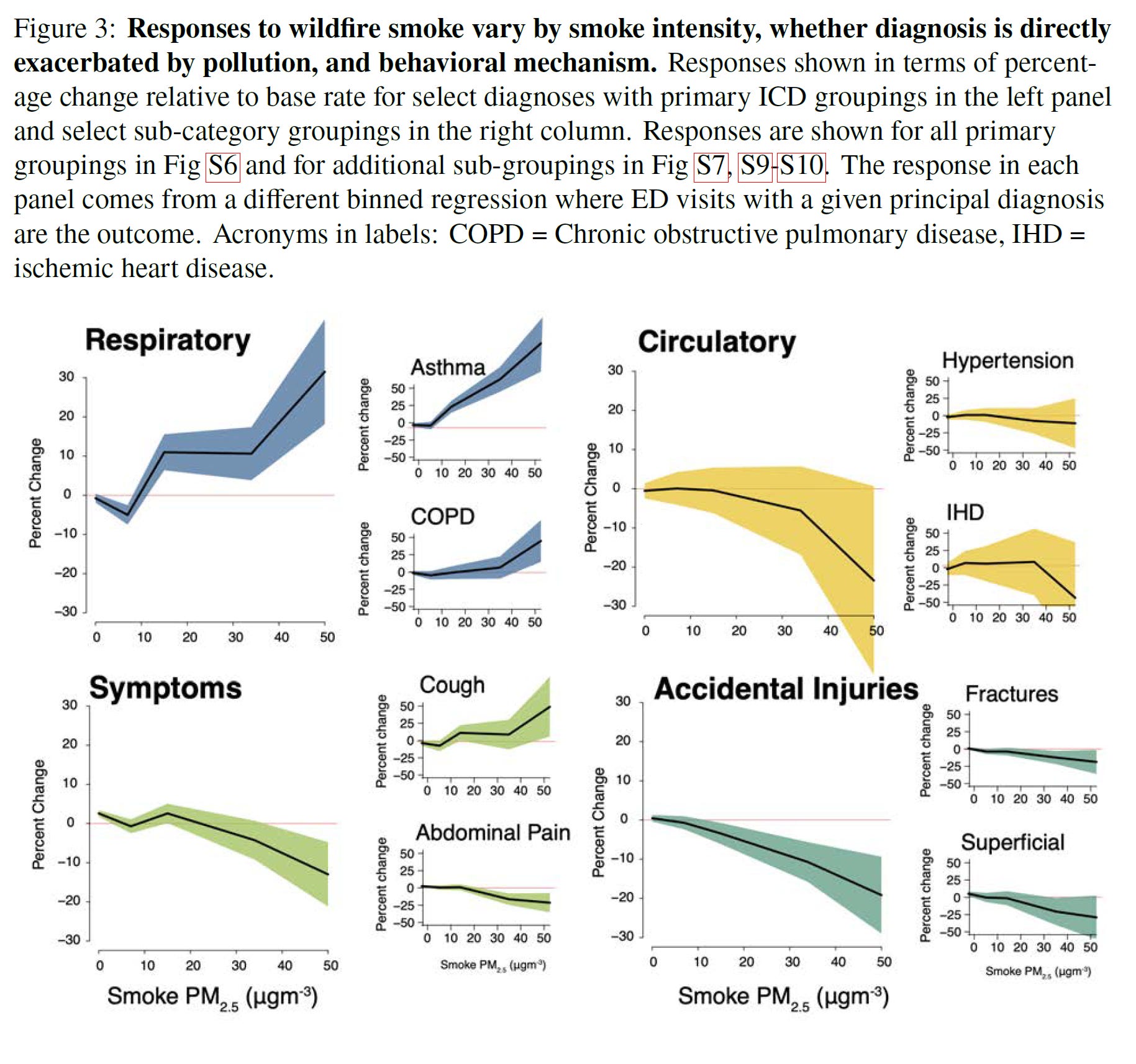 In this NBER working paper, Sam Heft-Neal and co-authors show that California emergency department visits for asthma, chronic obstructive pulmonary disease, and cough all increase by 30-110% in the week after an extreme smoke day. Even low levels of smoke significantly increase ED visits for respiratory issues.