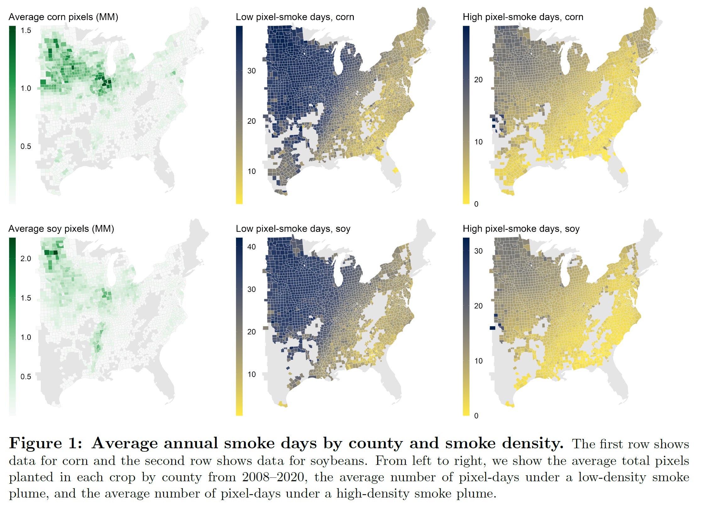 Light smoke plumes are relatively common in the cornbelt, averaging 30 days per year. However, heavy plumes are much rarer. This World Bank working paper by Patrick Behrer and Sherrie Wang estimates the effects of smoke plumes on corn and soybean yields.