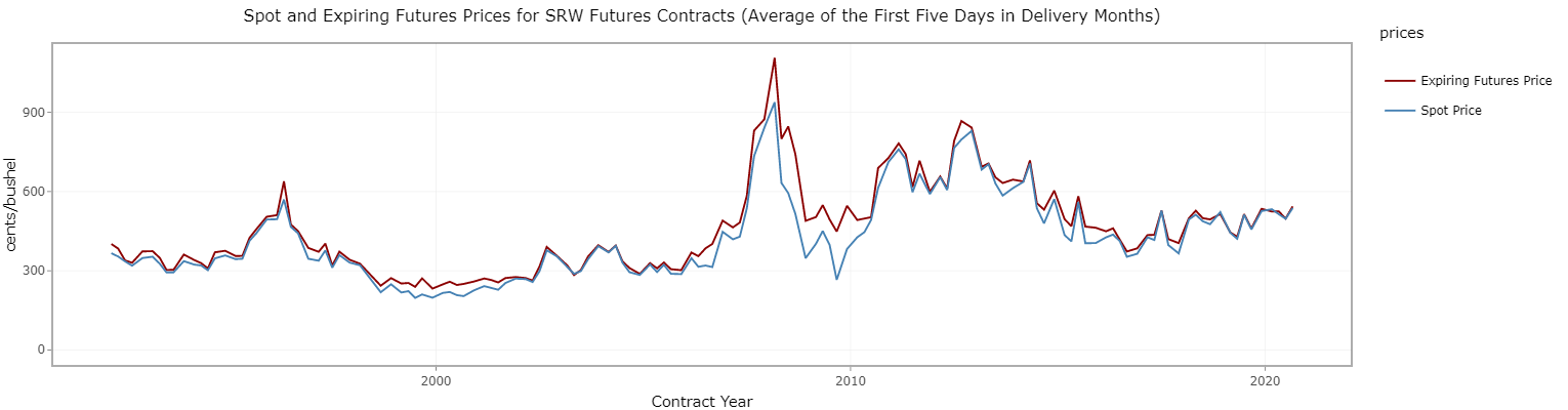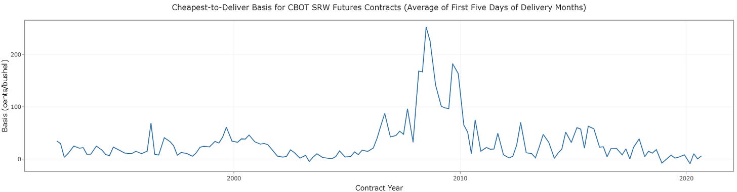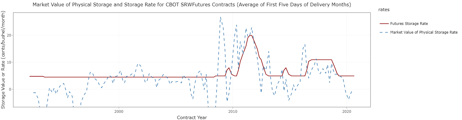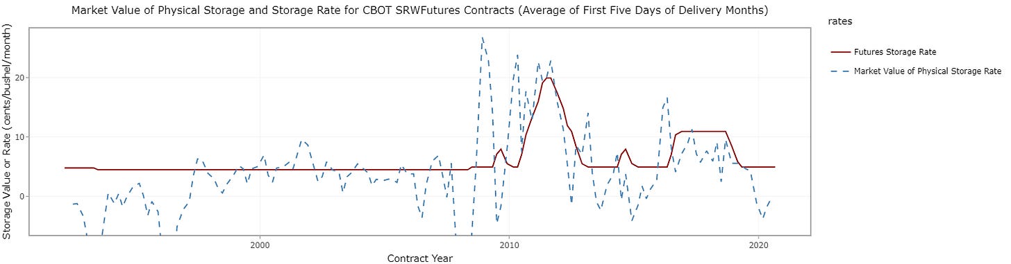 The Chicago Mercantile Exchange recognized this phenomenon and implemented a system in 2010 for soft red winter wheat that allows the maximum storage fee to adjust. The plot below shows that the price of storing wheat increased in 2008, which caused the non-convergence episode. When the futures storage rate increased in 2010, it solved the non-convergence problem. The price of physical storage also increased in 2016, but the futures storage rate adjusted before non-convergence became an issue.