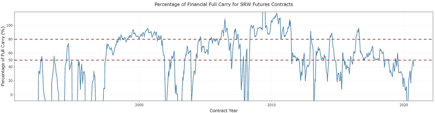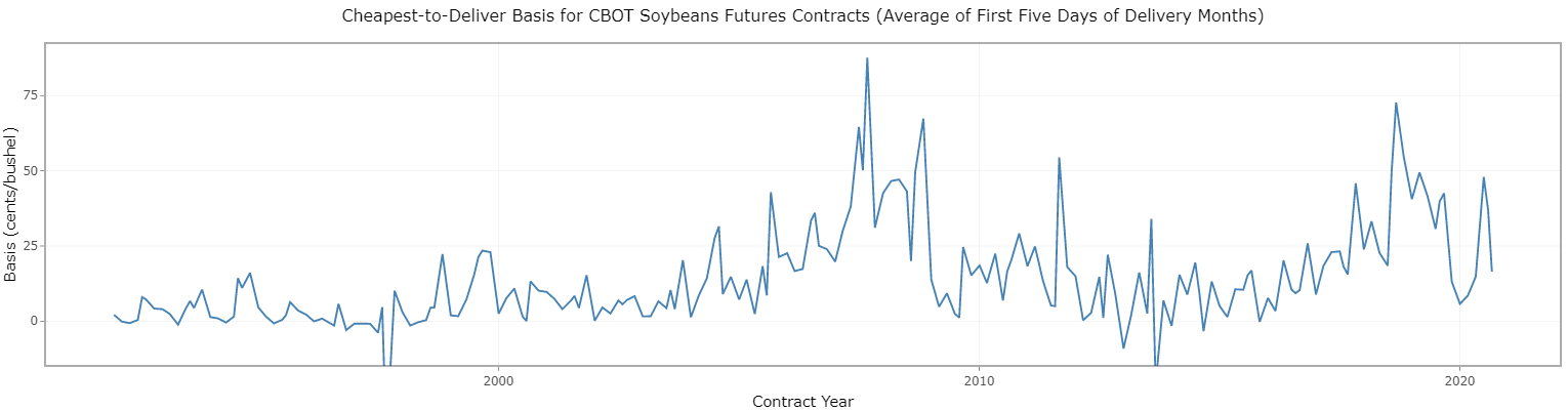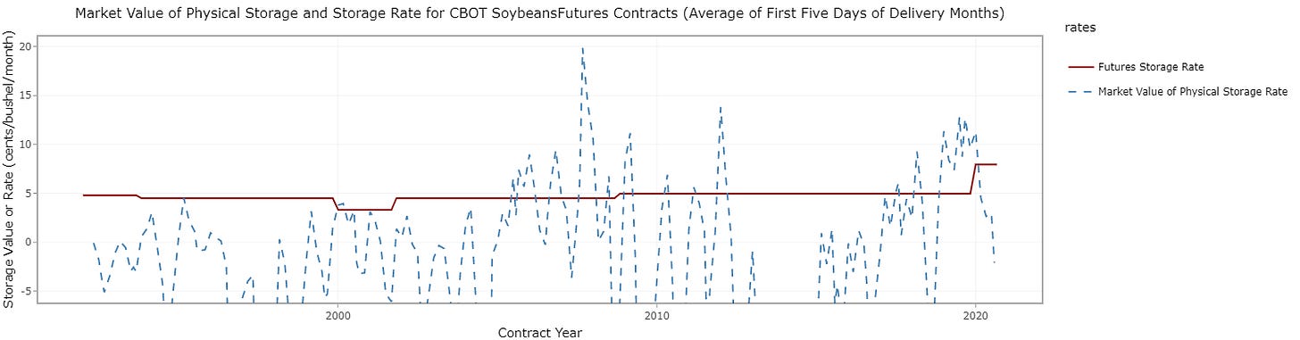 Unlike wheat, corn and soybeans do not have a variable storage rate system; they still operate with a fixed storage rate. Early in the trade war in 2018-19, soybean inventories accumulated because of reduced demand from China. This plot shows significant non-convergence in this period. The basis reached 72c per bushel (about 10% of the value of the commodity)