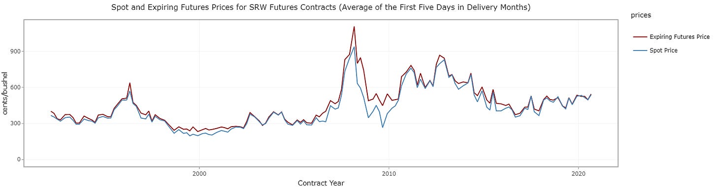 These plots are available in our new Convergence data app for corn, soybeans, SRW wheat and HRW wheat. Huge kudos to UC Davis ARE PhD student Shanchao Wang for putting this together.