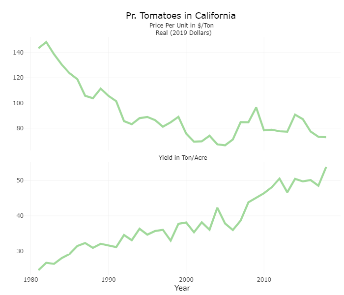 California farmers produce more than 50 tons of processing tomatoes per acre, which is more than twice as much as in the 1980s. In a pattern repeated for many agricultural commodities, increasing productivity leads to declining prices. If you increase supply, then the price goes down.