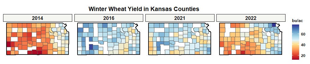 The best recent weather year for Kansas wheat was 2016, when it reached a record 57 bu/ac. Two years earlier, the yield had been 28 bu/ac, which was the worst year since 1995. More recently, 2021 produced relatively high yields and 2022 relatively low yield.