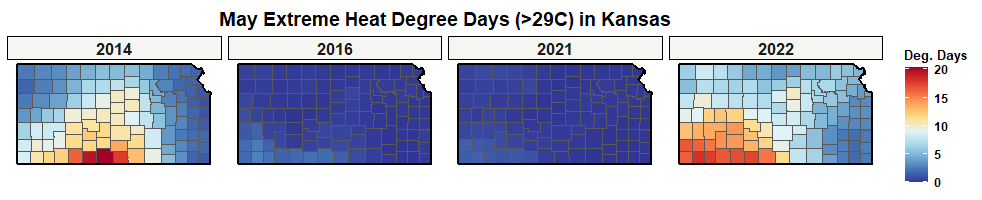 Avoiding extreme heat in May is an important key to a high-yielding crop. In both 2016 and 2021, the state saw almost no days above 29°C in May. May precipitation appears less related to yield, as 2016 produced high yield despite being quite dry, especially in the western part of the state. That said, western Kansas had a very dry March and April this year, so the wheat crop probably needs some May rains.
