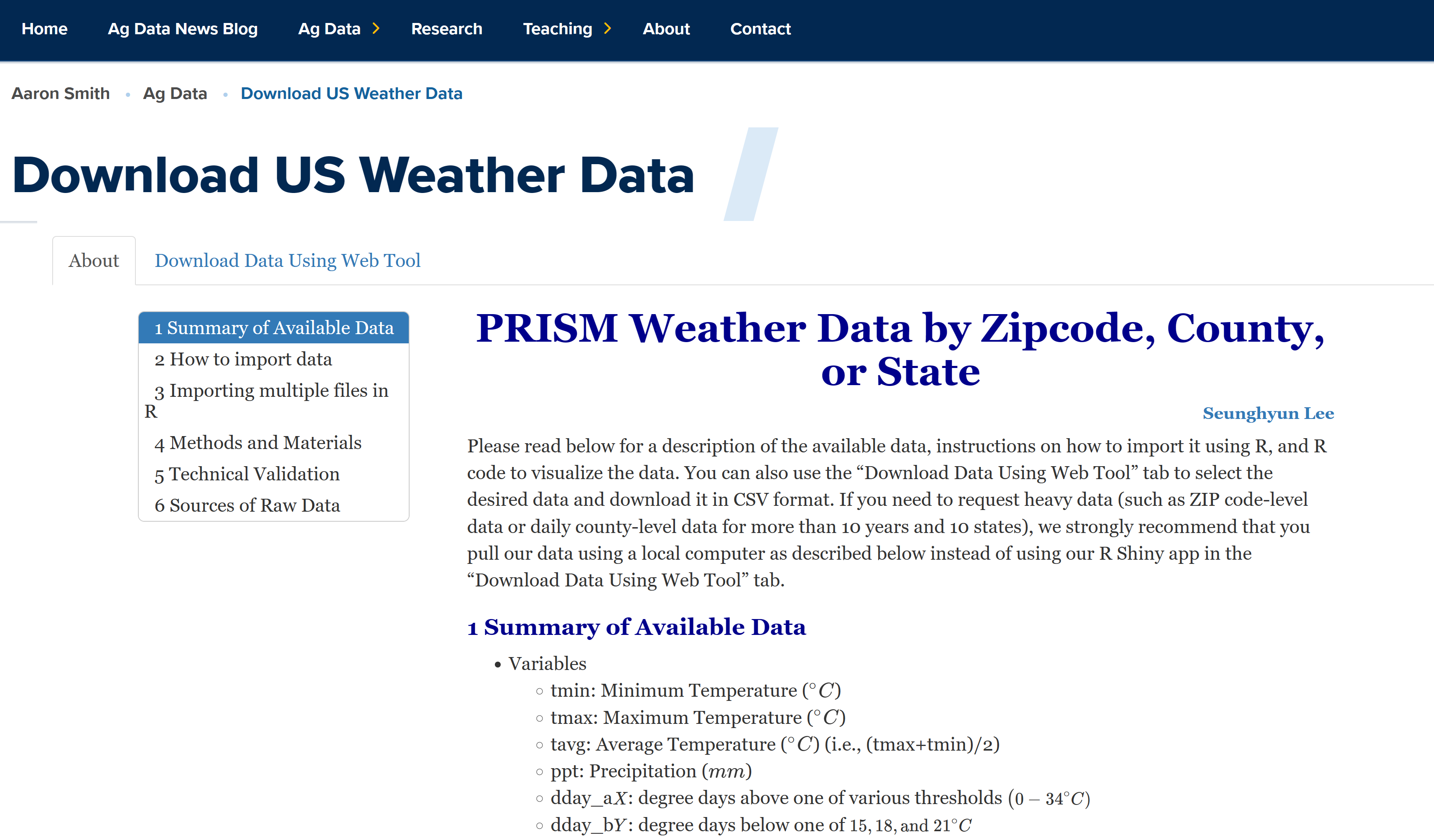 This project was inspired by Wolfram Schlenker, who provides Stata code and raw weather data for constructing cropland-weighted county-level weather data for the Contiguous US for 1950-2019. However, due to the need to make various decisions when constructing these data, our results and Wolfram’s data are not always identical. In the Technical Validation section of the tool, we compare our data to Wolfram's.