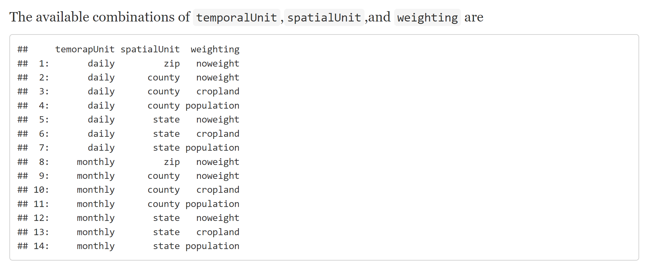 Here's what our web tool looks like. We strongly recommend that you use this tool only if your request is not too heavy (e.g., don't use it for ZIP code-level data or daily county-level data for more than 10 years and 10 states). For heavy data requests, it is better to import directly into your data analysis software (e.g., using the sample R code we provide in the app).