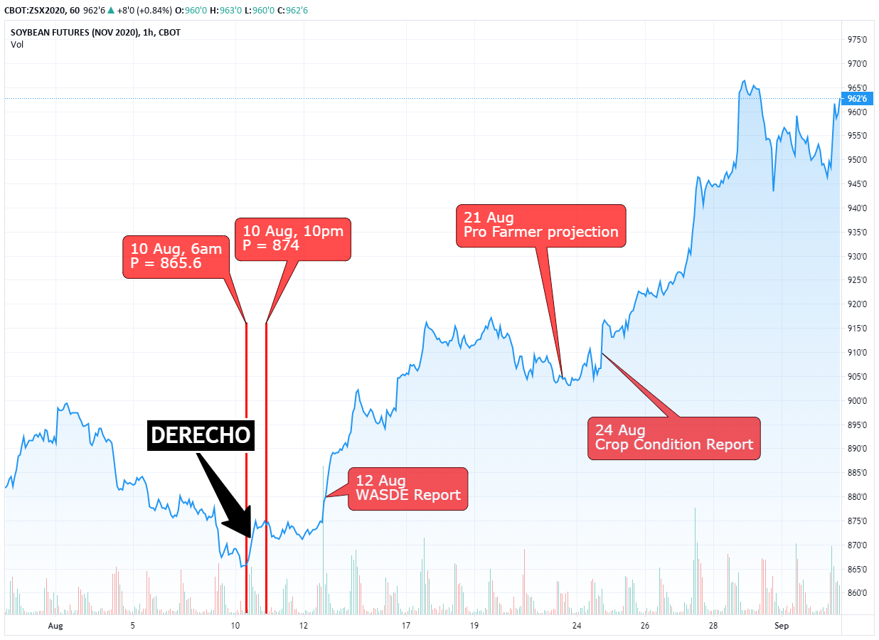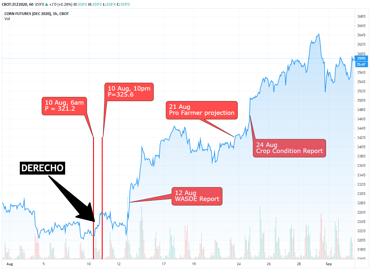 Announcements in the ensuing weeks have also caused price increases prices, including the USDA's WASDE projections, Pro Farmer's projections, USDA's crop conditions report, and relatively hot and dry weather. How much of these increases reflect the derecho?