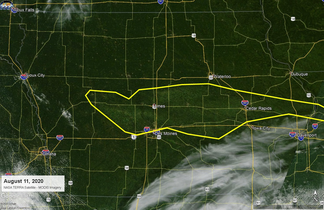 Initial media reports estimated that the storm damaged 14 million acres of Iowa cropland. Satellite imagery suggests that the winds damaged about 6 million acres of corn and soybeans (circled below), which is about a quarter of Iowa acreage and 3.6% of projected national acreage.
