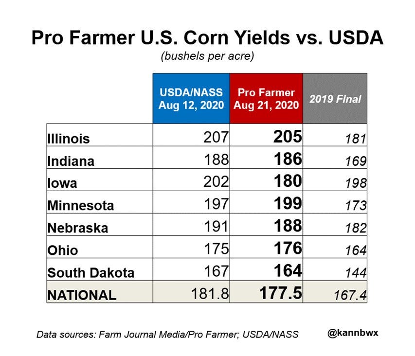 The Pro Farmer crop tour survey, which occurred after the Derecho, estimated that Iowa corn yields would be 10.9% lower than what USDA projected using pre-derecho data. In other states, Pro Farmer projects 1% lower yield, so it seems reasonable to conclude that the derecho could have reduce Iowa corn production by as much as 10%, or about 280 million bushels.