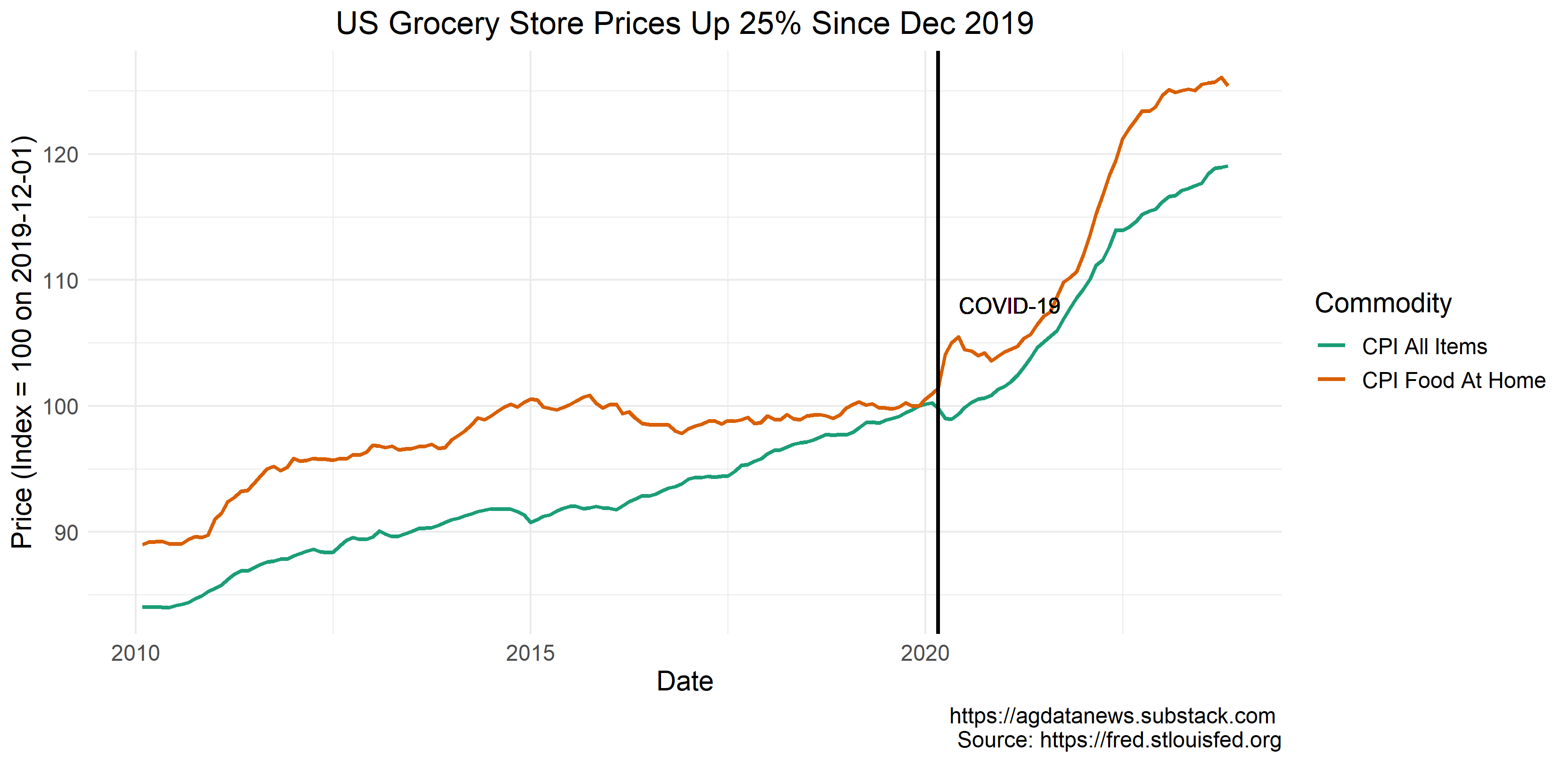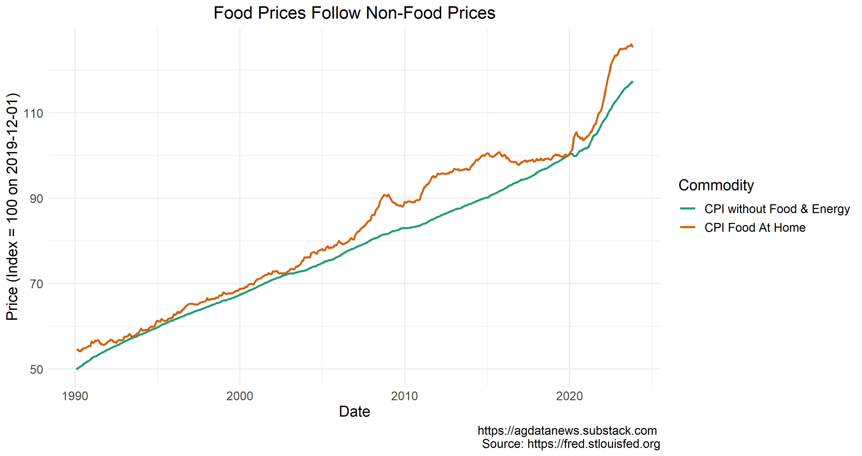 In the long term, food prices follow non-food prices. In 2007-08, food prices inflated faster than non-food prices. Then they grew more slowly over the next decade until they were back on par in 2019. Food prices may fall somewhat in 2024, like in 2009 or 2017, but mostly they will tend to grow more slowly than other prices for the next few years.
