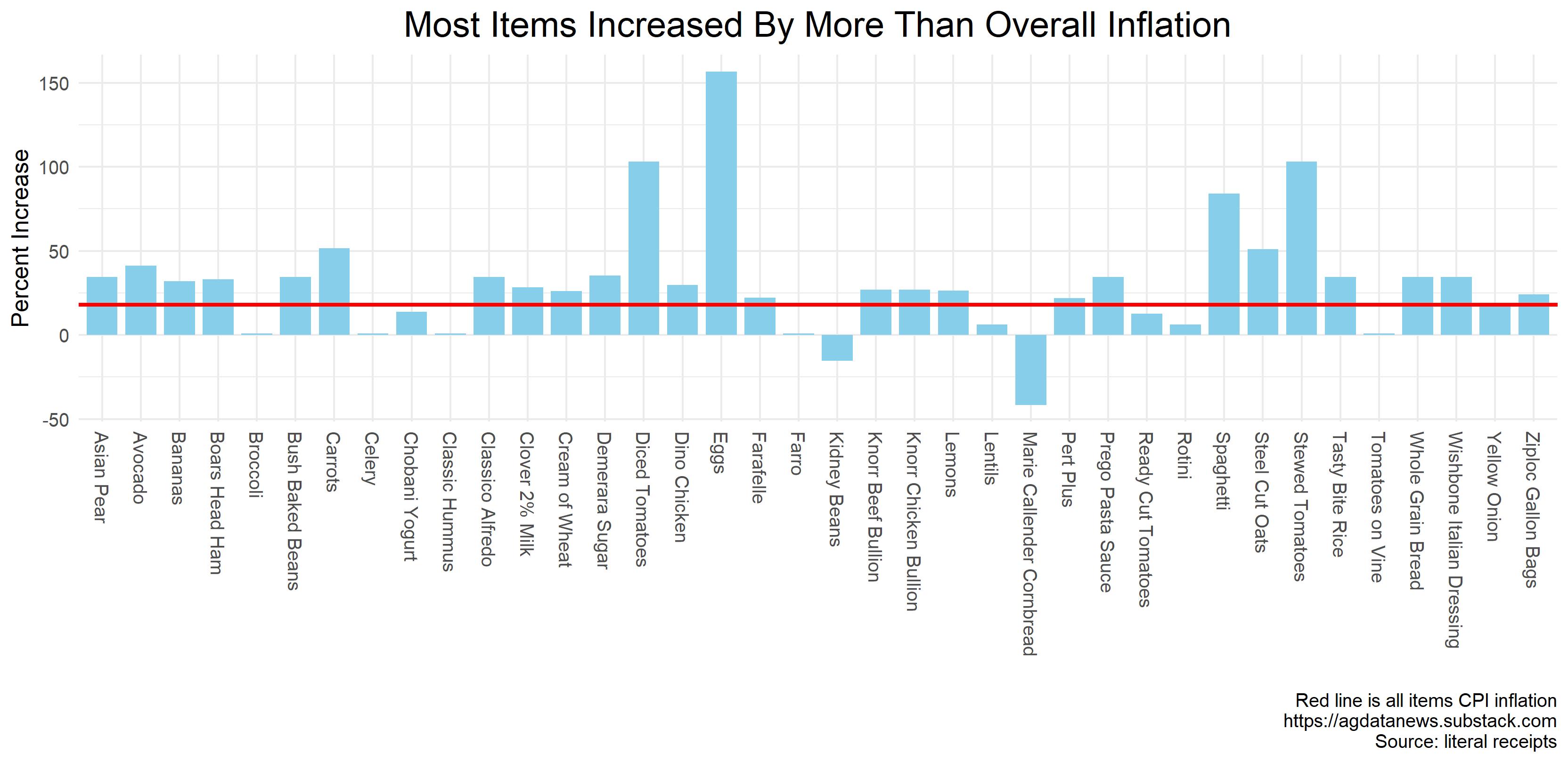 Most of my grocery items increased by more than the CPI. Some items were on sale in 2019 (diced tomatoes, spaghetti), whereas others were on sale in 2023 (kidney beans, cornbread mix). Eggs were up 157%, partly because eggs sold in California are now required to be produced cage free and partly because the avian flu has returned, although not nearly as badly as last year.