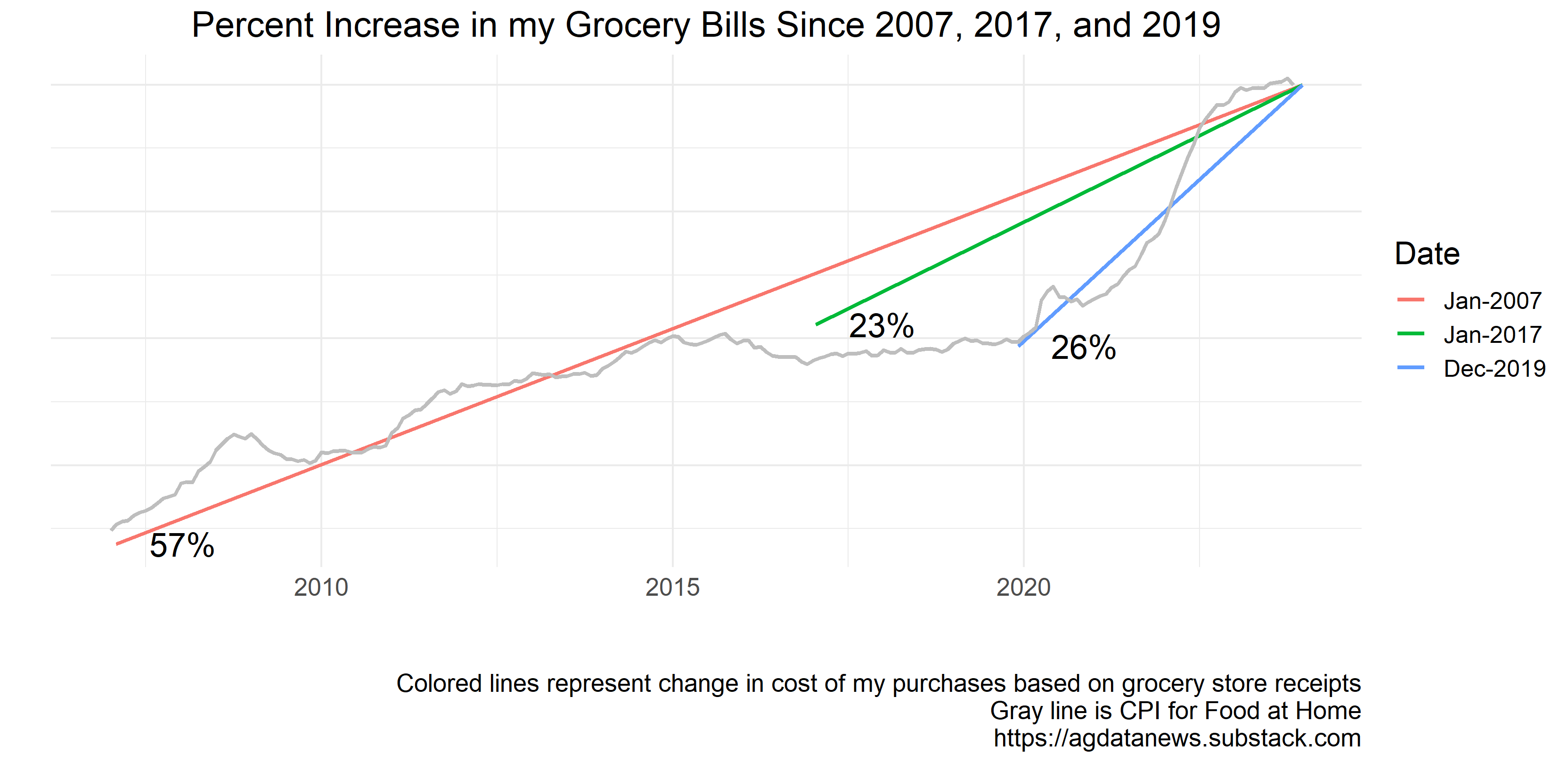 I couldn't find any paper receipts from prior to December 2019, but I found some receipts from online orders we made at safeway.com in 2007 and in 2017. I compared prices from those orders (two orders in early 2007 and three orders in early 2017) to current prices on safeway.com. My 2007 orders would cost 57% more today, which is almost identical to the increase in the CPI for food at home. My 2017 orders would cost 23% more today, which is a slightly smaller increase than indicated in the CPI.