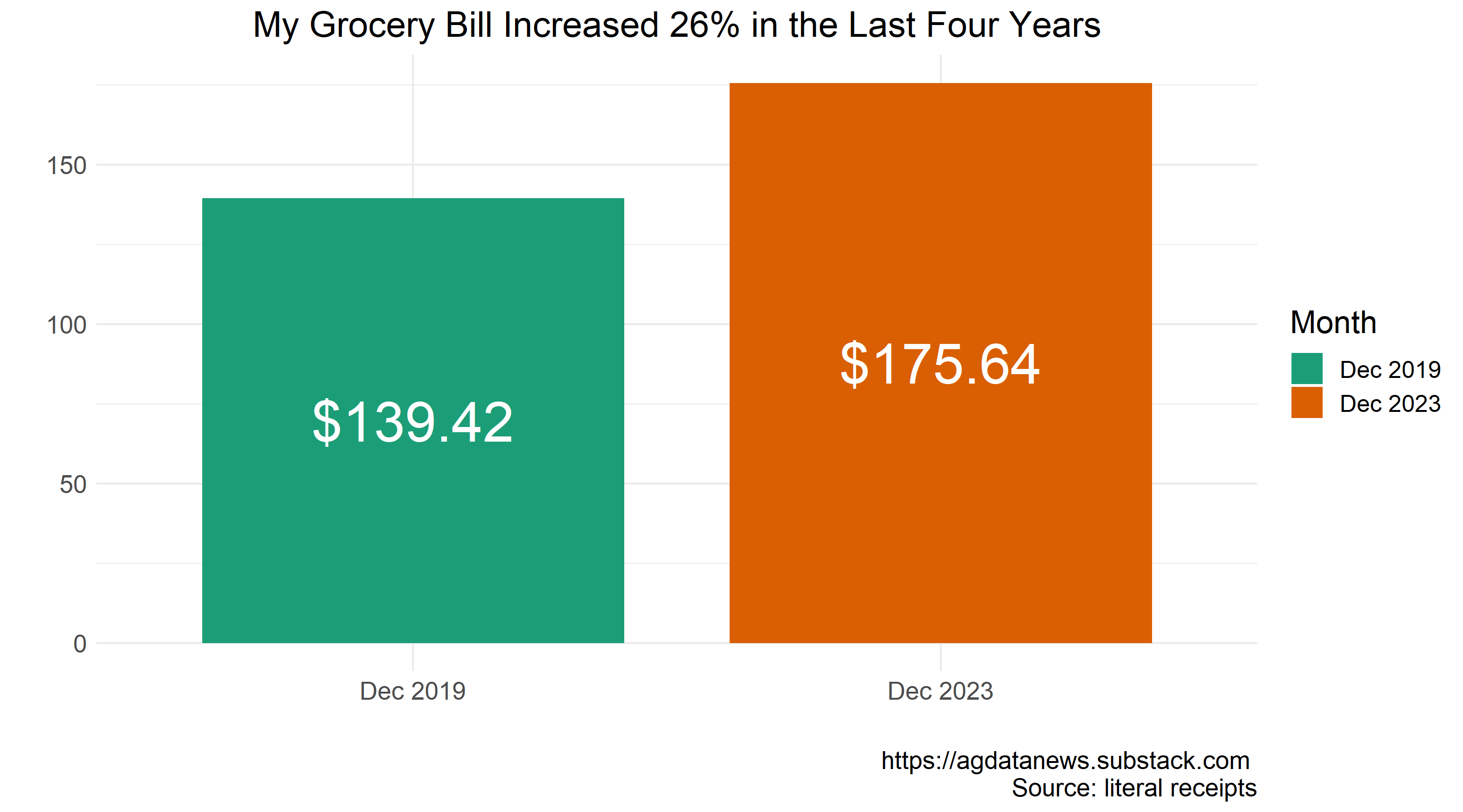 Last week, I found a receipt from December 2019, which provides a perfect way to assess how prices have changed for the foods I buy. Have the prices of things I buy changed by the amount government data says they have?