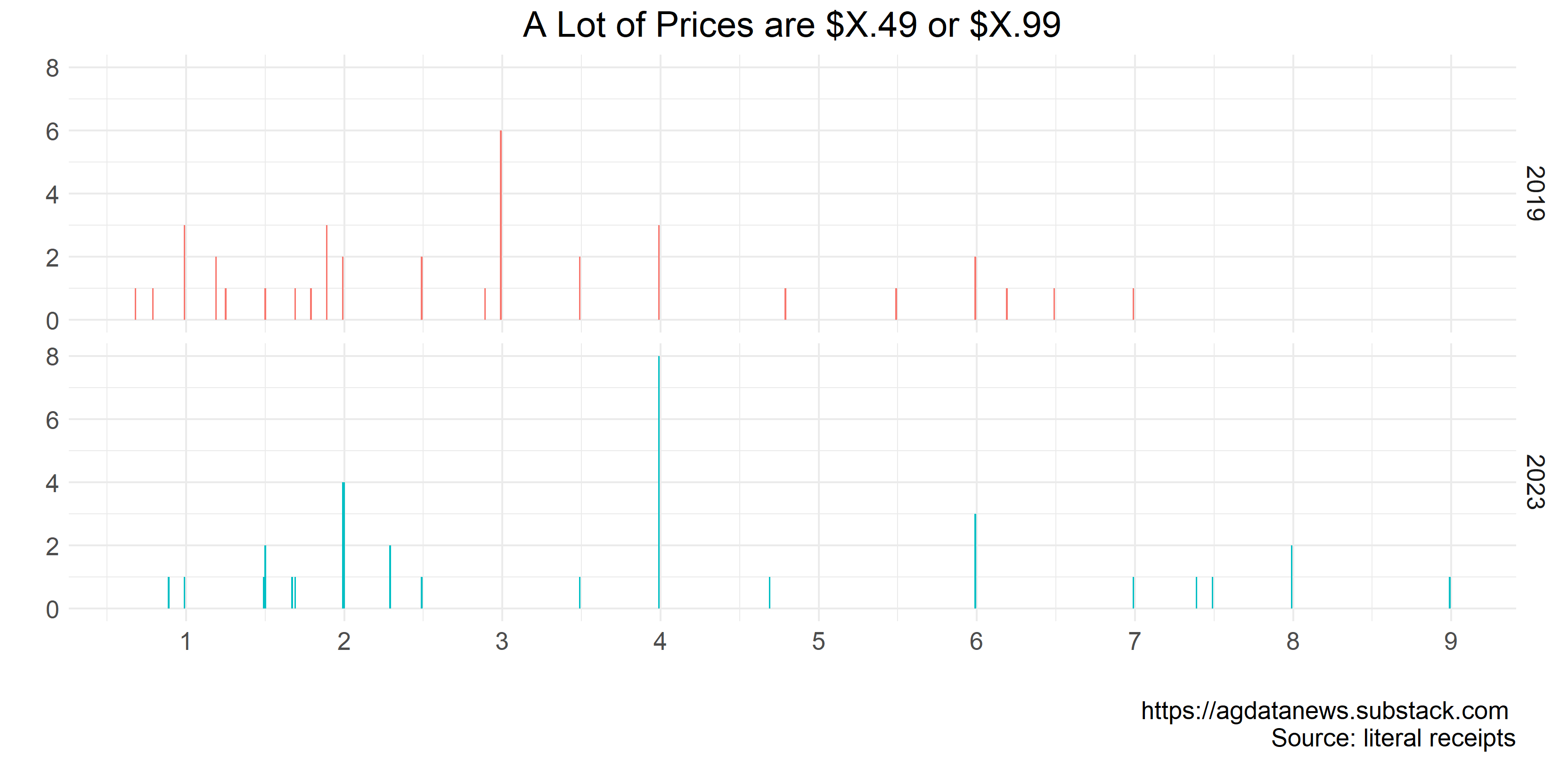 One reason we are more conscious of increase in the price of food than other goods is that we buy food often and in an environment where we can see and compare prices. But, here's another theory about why people may sometimes notice big jumps in food prices: a lot of items are priced at $X.49 or $X.99.