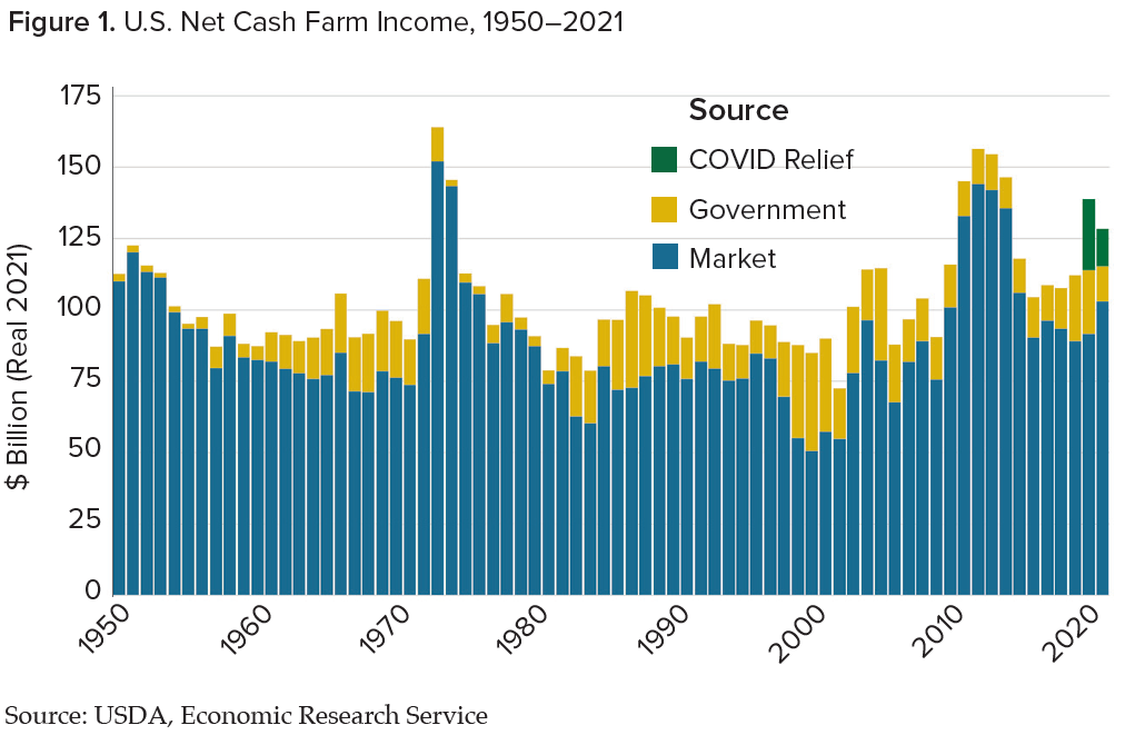 The graphs in this article and in my ARE Update article were generated by this R code (although great work from Ria, Tiffany, and Julie ensured that the versions in ARE Update look much better than what I made with this code). Data sources: USDA ERS Farm Income and Wealth Statistics, NASS Quickstats, CFAP 1 dashboard, and CFAP2 dashboard.