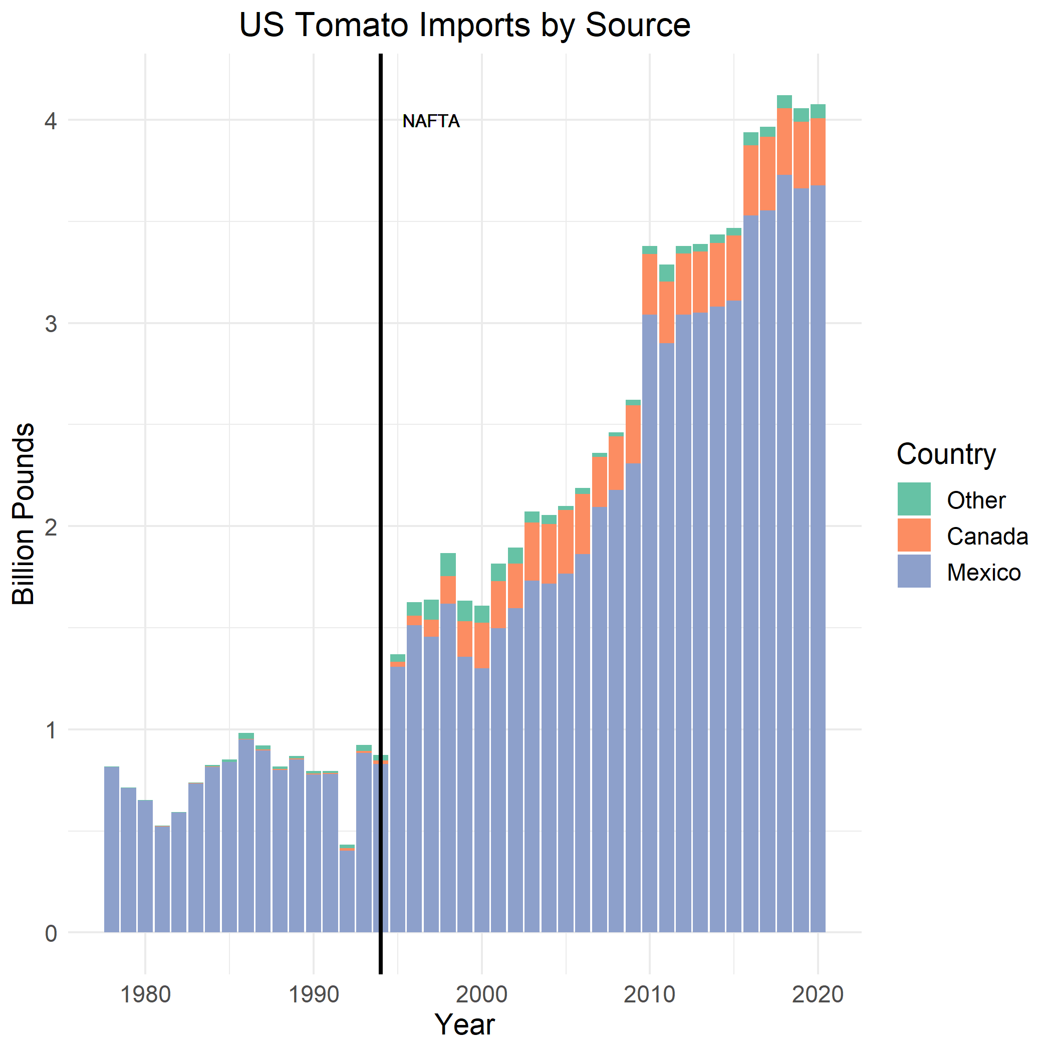 Compared to 1994, the volume of imported fresh tomatoes from Mexico immediately jumped from 0.8 billion pounds to 1.3 billion pounds in 1995, which amounts to a 50% growth. The imports from Mexico continued to grow dramatically in the following decades, and reached 3.7 billion pounds in 2020, which accounts for 90.7% of US total imports of tomatoes.