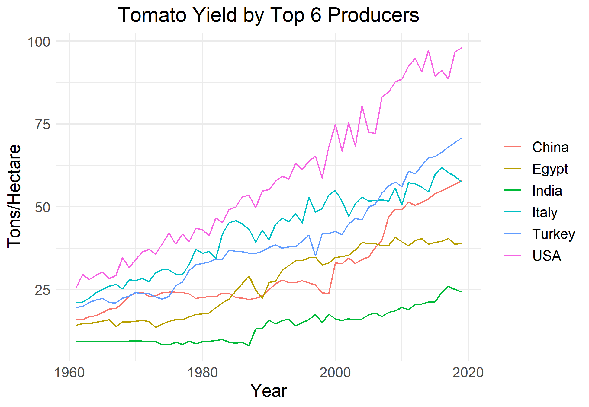 The US has the highest tomato yield among the top six tomato producers. Tomato yield in the US, which has almost quintupled over the past six decades, was about 100 metric tons per hectare in 2019.