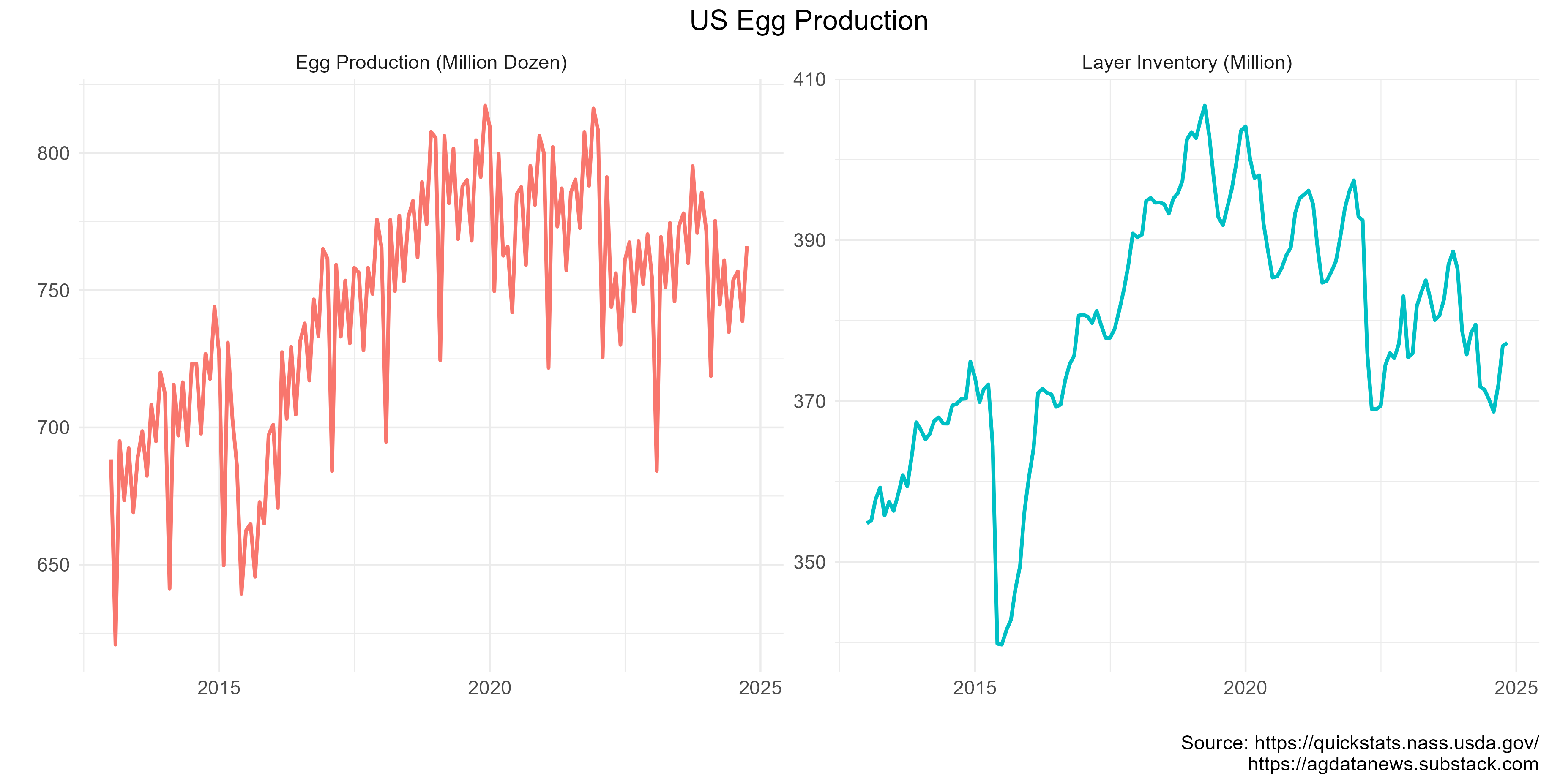 The low chicken numbers may be partly due to California’s Proposition 12, which requires animals held in buildings to "be housed in confinement systems that comply with specific standards for freedom of movement, cage-free design, and minimum floor space." This requirement took effect for egg-laying hens on January 1, 2022. Since then, several other states have followed suit.