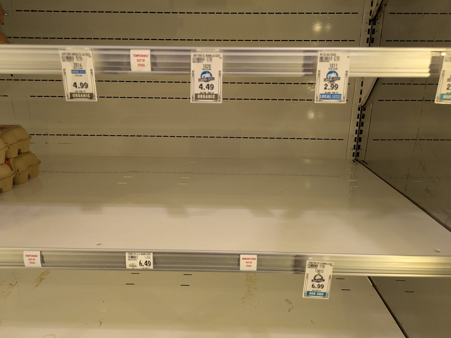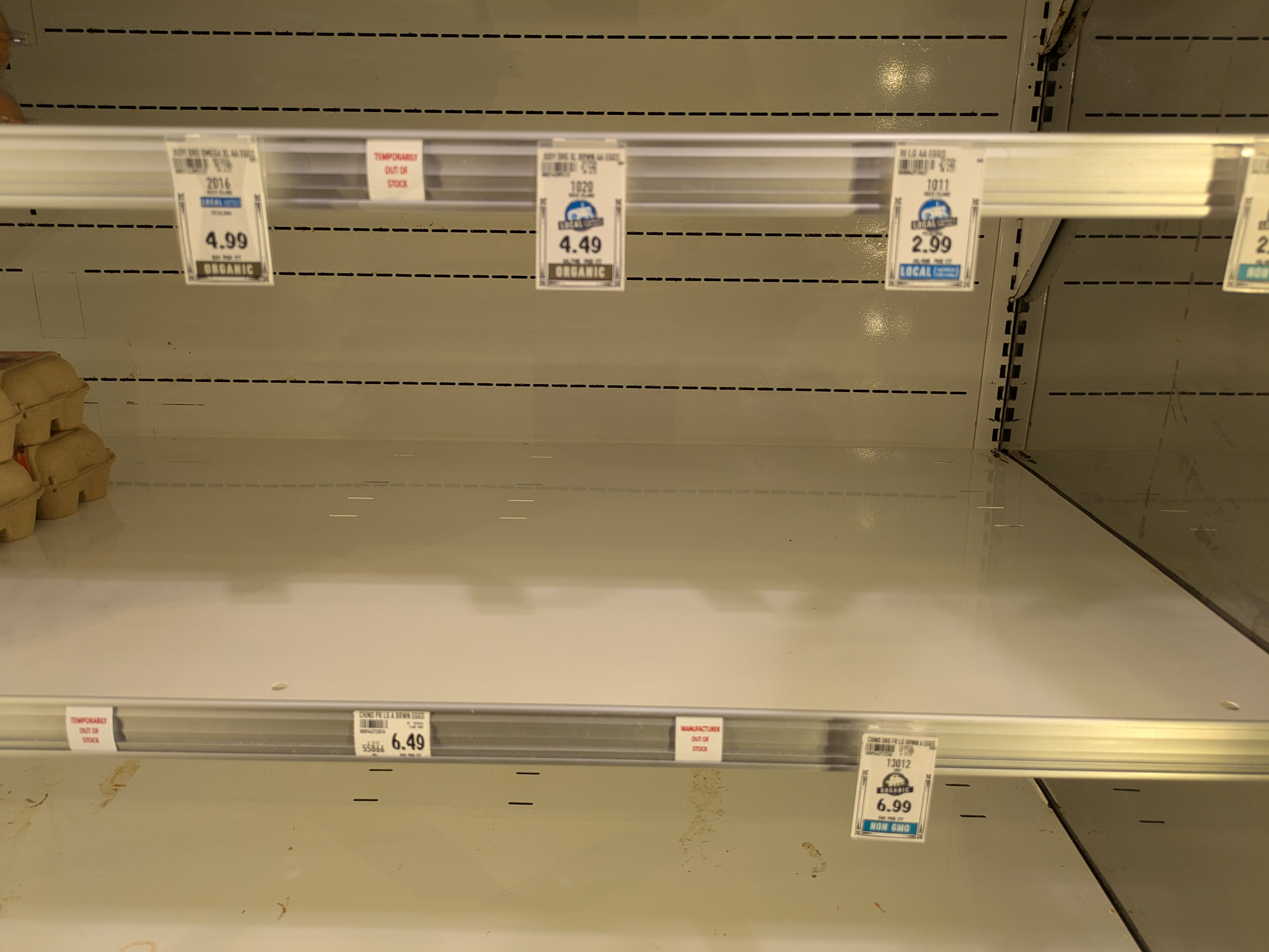 Last weekend, I was chatting with the checkout person at my local grocery store when she got a text from her mother. “Do you have eggs?” it read, “because Safeway and Raley’s are out!” I walked over to check the shelves and, sure enough, most were empty.