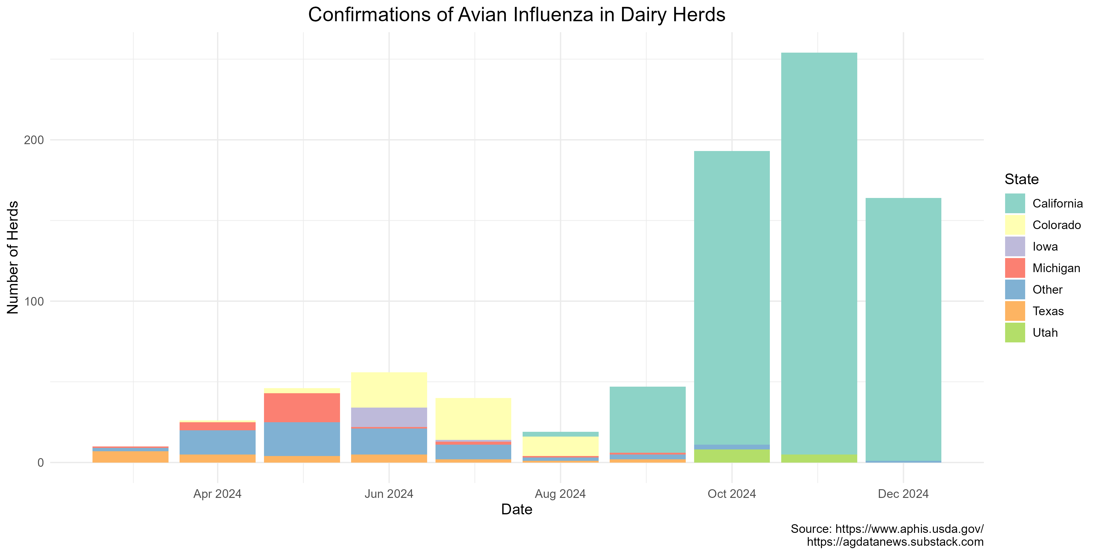 In the past few months, more than half of California’s dairy farms have reported cows infected with avian flu. As I wrote a couple of months ago this is not a huge concern for the supply of dairy products because pasteurization kills the virus. Almost every product sold in stores is pasteurized. Milk futures prices have declined somewhat in the past two months, but they have not crashed like you would expect if people were avoiding dairy products out of concern. They have also not spiked like they would if supply had been curtailed by the virus.