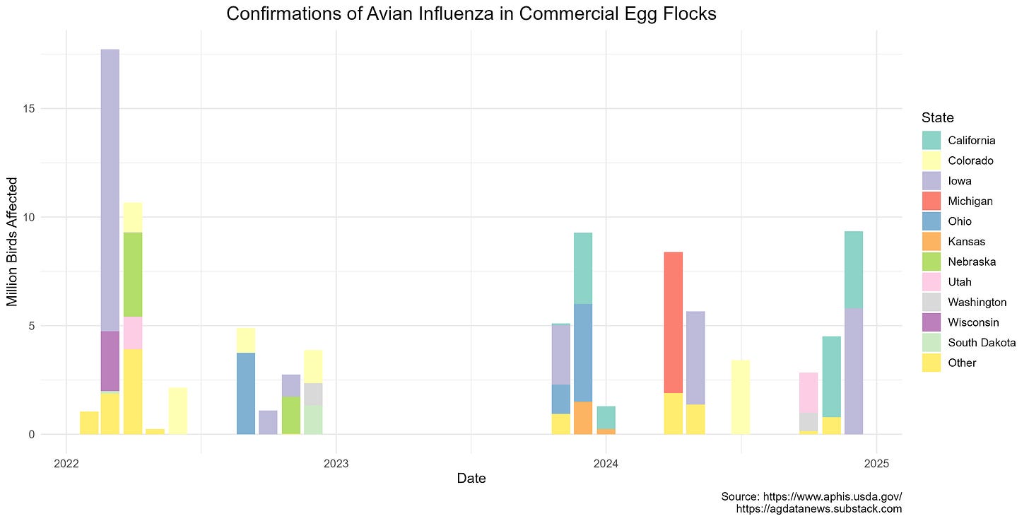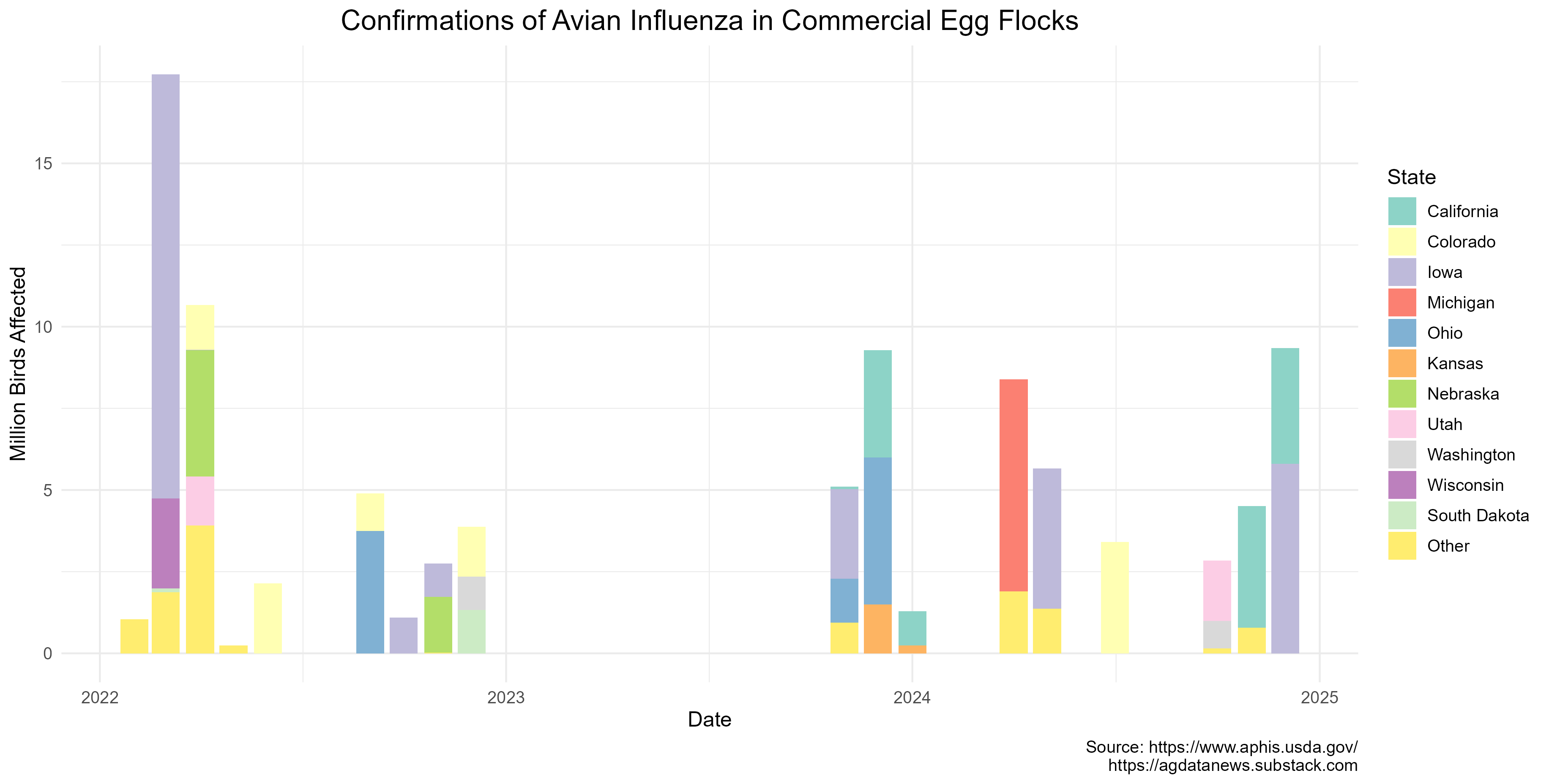 So far this month, almost 10 million egg-laying hens have been lost to avian influenza, almost all in California and Iowa. This came on top of the 7 million lost in October and November. Egg production is at its highest at this time of year as people eat more eggs during the holidays.