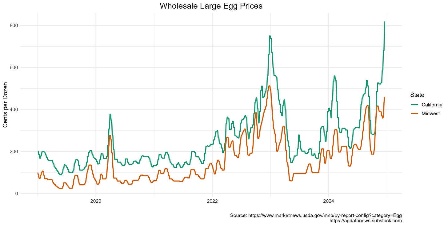 Eggs quintupled in price in late 2022 due to an outbreak of avian flu (H5N1), which caused millions of chickens to be killed, thereby reducing the supply of eggs. It’s happening again. California wholesale prices are now higher than their 2022 peak (unadjusted for inflation).