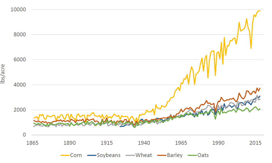 Agricultural productivity in the United States has grown substantially in the past 100 years. Farmers produce four times as much output from each unit of land, and 17 times as much output from each unit of labor, as they did a century ago. Of the major crops, average corn yield increased eightfold and average soybean yield increased fivefold over this period.