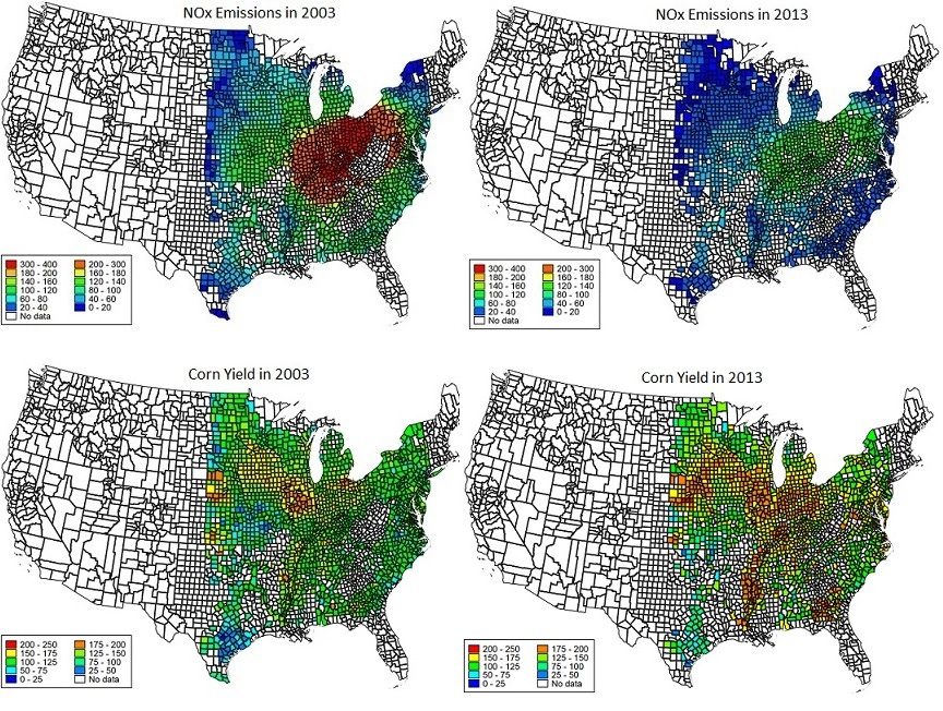 Kostas and I quantify the crop yield increases attributed to reductions in the emissions of nitrogen oxides (NOx) from electric power plants. Large amounts of NOx emissions from coal-fired power plants react with volatile organic compounds in the presence of sunlight to produce ozone. High ground-level ozone in the summer slows photosynthesis and thereby reduces crop production per acre (yield).