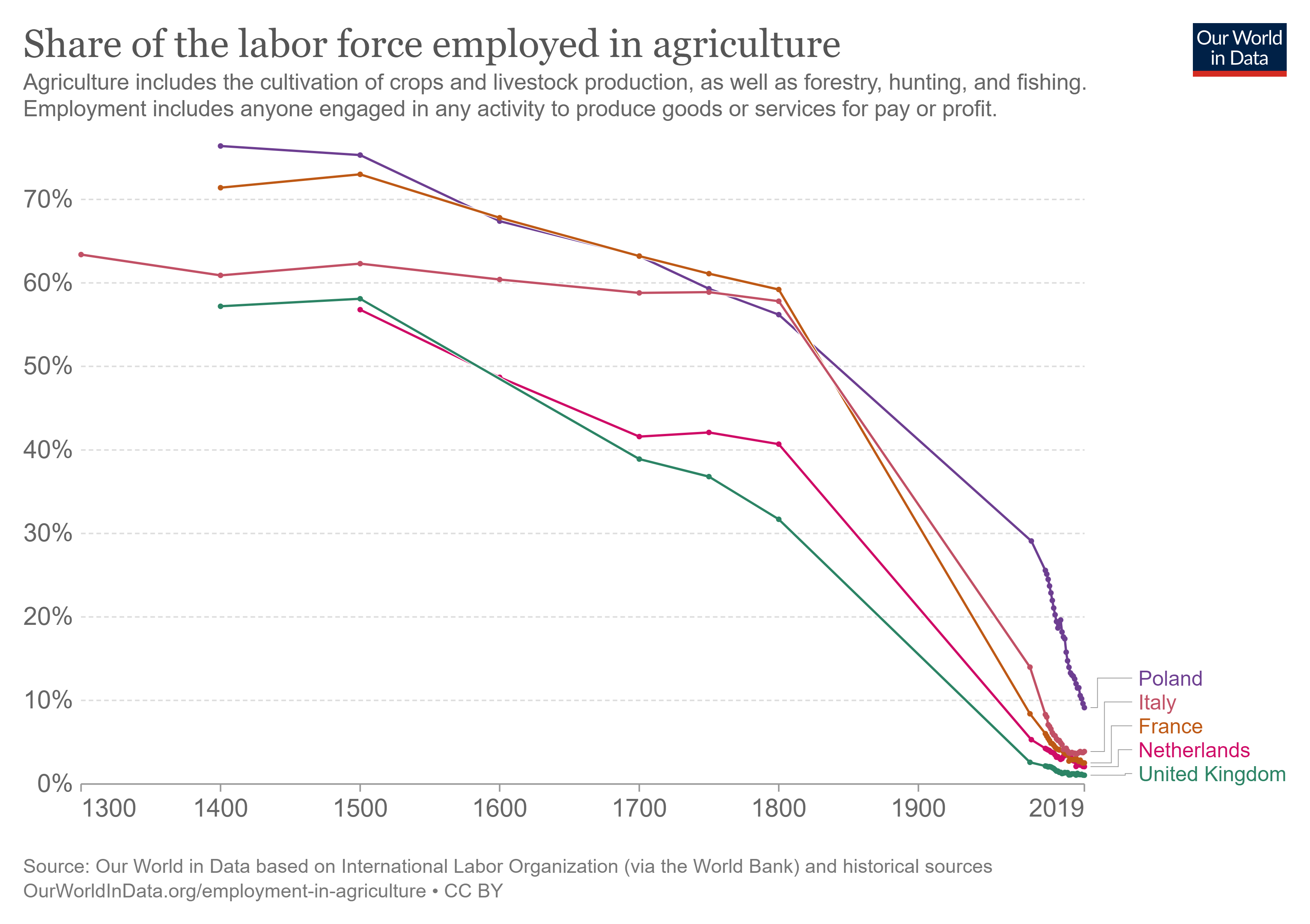 Advancements in agricultural technology have vastly reduced the percent of the labor force working in agriculture. A few hundred years ago, up to three quarters of the labor force worked in agriculture. In most rich countries, the agricultural share of the labor force is now less than 10%. In the United States, 1.3% of the labor force currently works in agriculture, down from 50% in 1870.