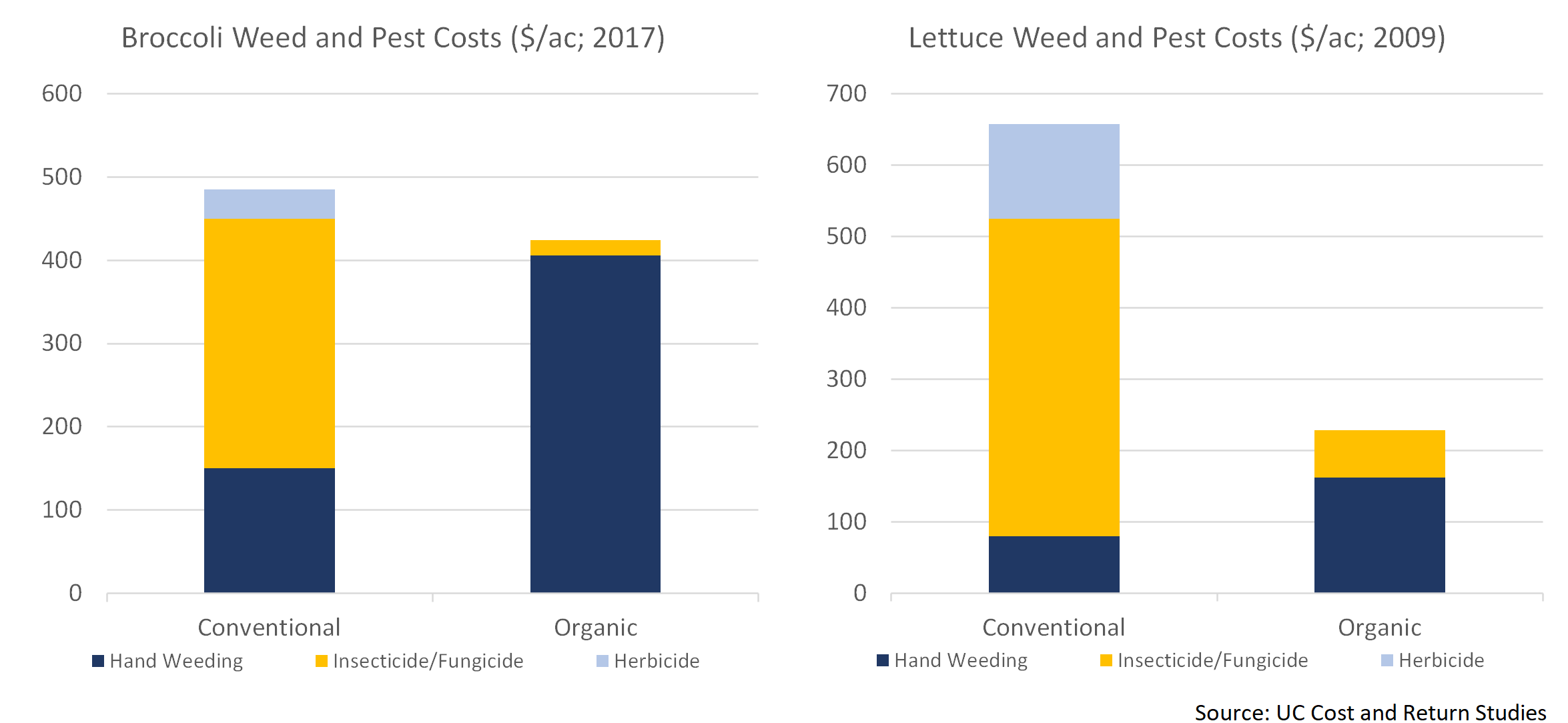 Robotic weeding is currently particularly attractive for organic producers. Restrictions on what organic producers can spray means that they spend much more on hand weeding than do conventional producers. Robots have the potential to more than halve weeding costs, so we're looking at $100-$300 per acre in cost savings for lettuce and broccoli.