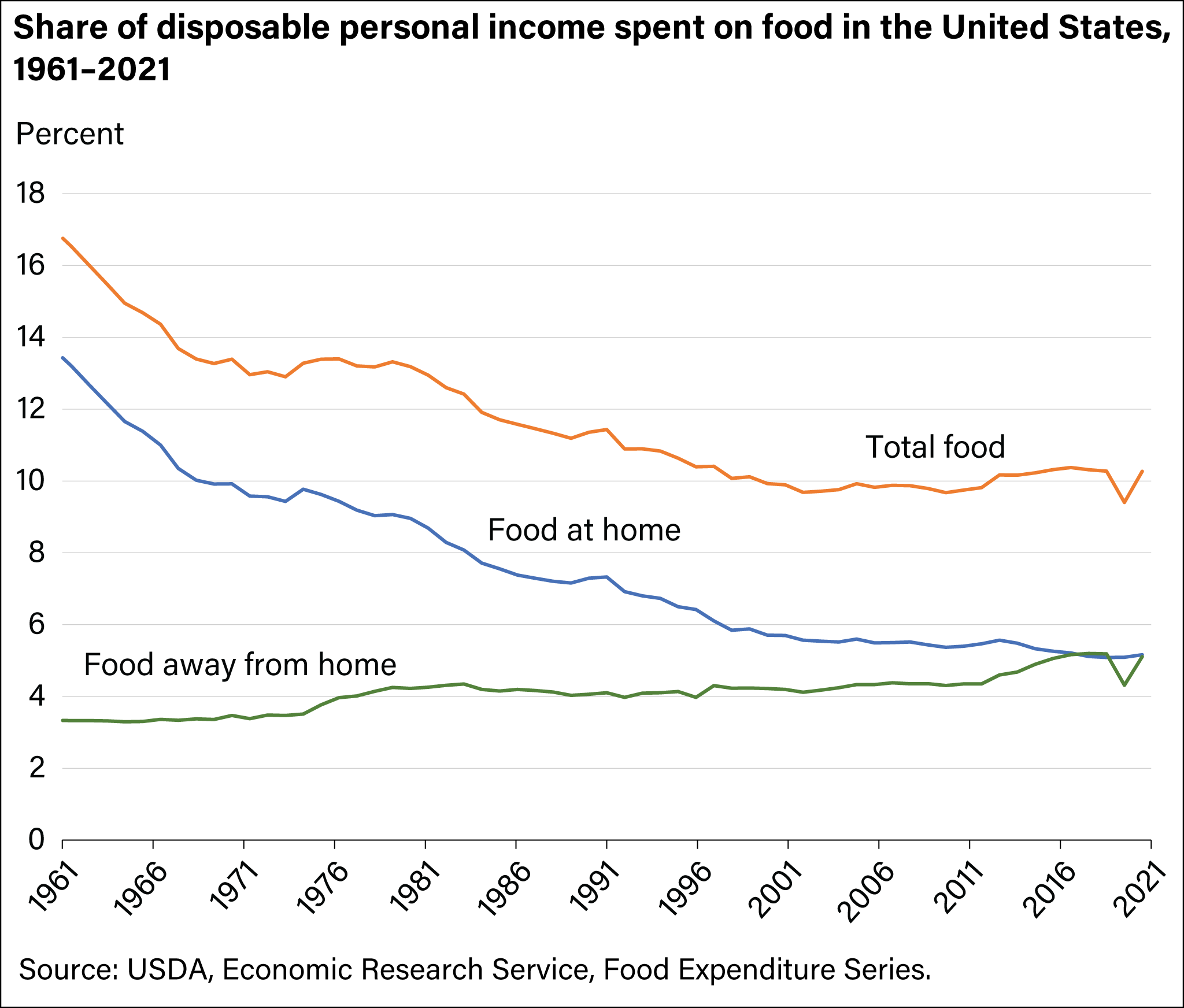 Technologies like tractors made it possible for each worker to produce a whole lot more food. This increase in productivity caused an abundance of food that has lowered the relative food price. Americans can buy five times as much milk per hour of work than they could 100 years ago. Americans spend just 10% of their household budget on food now, down from 17% in 1960.