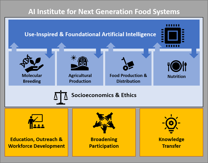 AIFS will develop generalizable, data-efficient, and trustworthy AI solutions to enable (1) Molecular breeders to discover and/or design the next generation of high yielding, high-quality, consumer-focused foods, (2) Agricultural producers to maximize food quantity and quality, while minimizing resource consumption and waste, (3) Food processors and distributors to deliver highly traceable and safe food, while minimizing resource consumption and waste, and (4) Consumers to rapidly and precisely assess the nutrition of a meal, quantify the food’s molecular composition, and predict the impact on their health. AIFS will extend these solutions through programs in Education, Outreach, and Workforce Development.