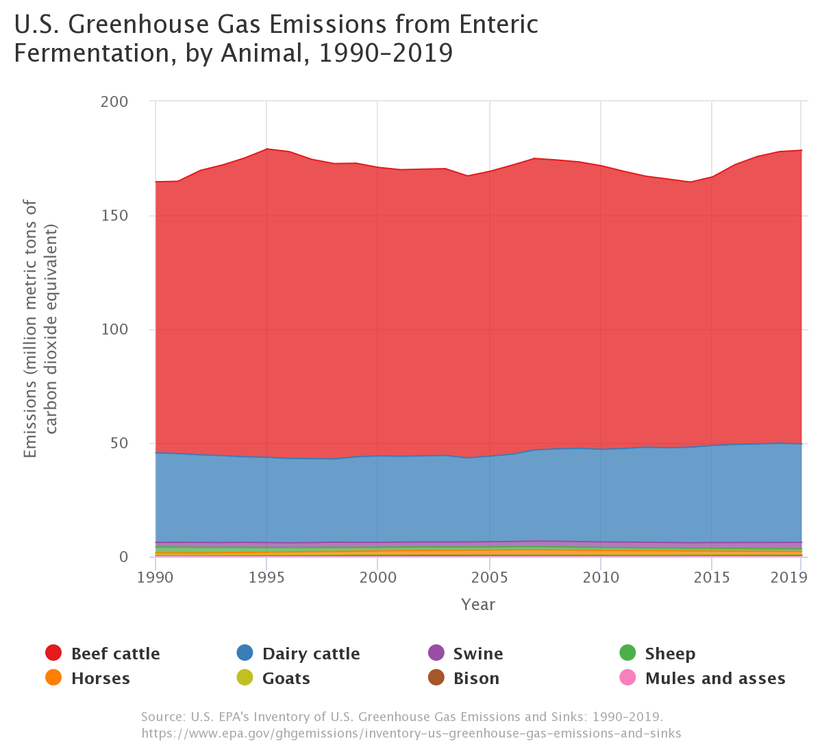 Cattle generate almost all the methane emissions that come from burps (enteric fermentation). There are about 30 million beef cattle and 10 million dairy cattle in the US, so beef cattle emit three times as much methane from burps as dairy cattle. Sheep and goats are smaller than cattle and there are fewer of them, so their emissions are much lower. There are 5 million sheep and 2.5 million goats in the US.