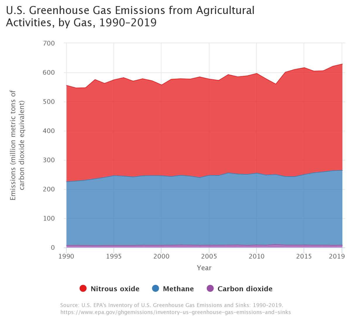 Livestock emit relatively less GHGs in the US than in the rest of the world. In 2019, US livestock contributed 260.5 tons of CO2 equivalent emissions, which is 4% of the US total. Essentially all livestock GHG emissions are methane from burps and manure. Ruminant animals such as cattle, sheep and goats use their fore-stomachs to digest foods that humans cannot. In the fore-stomach, bacteria break down hard-to-digest food and emit methane as a by-product. Similarly, manure from livestock in feedlots or other confined facilities is often disposed of in lagoons where bacteria break it down and emit methane.