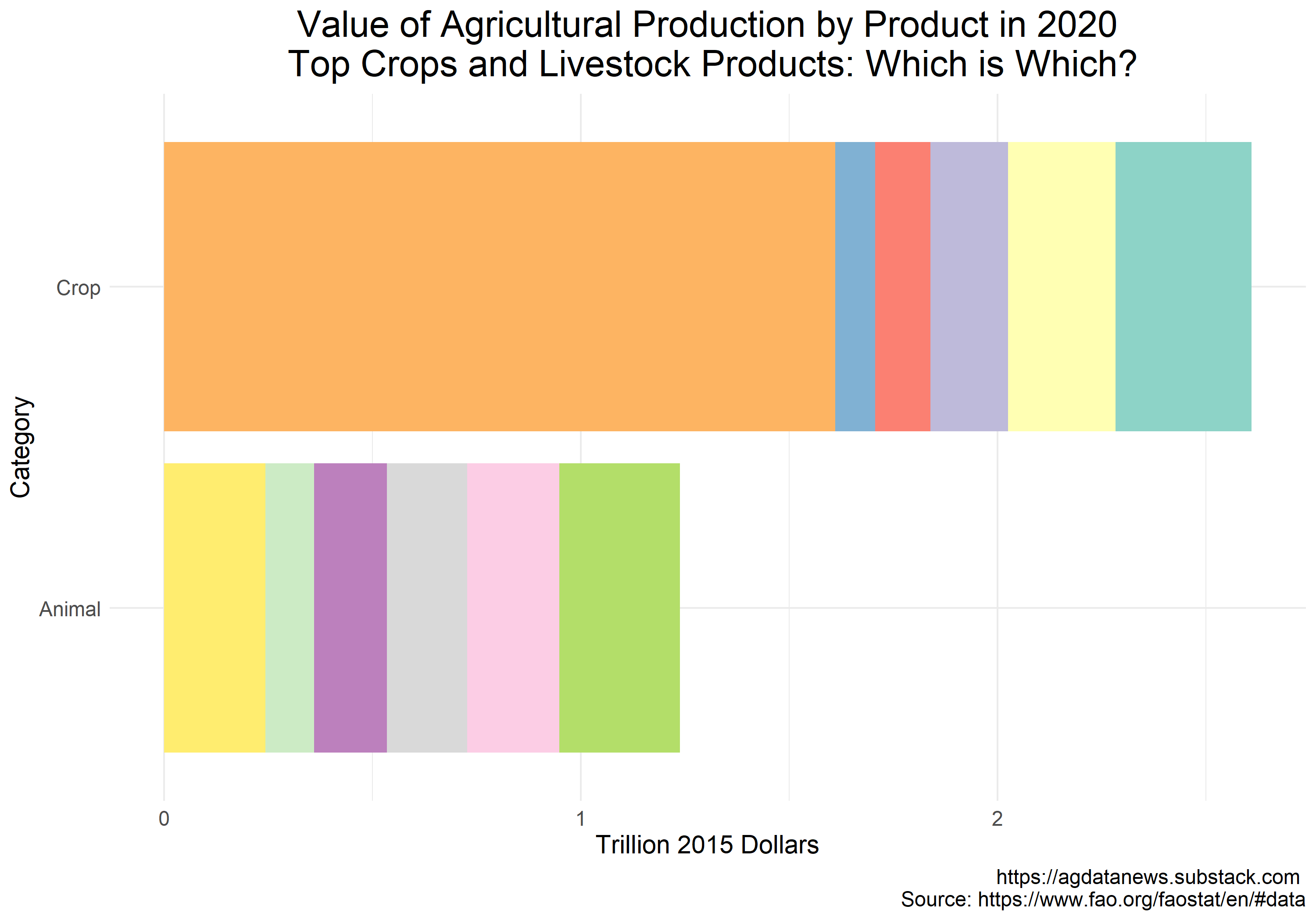 The six colors next to "Crop" in the figure below represent the value of agricultural production in 2020 in the top 5 crops plus "other". The six colors next to "Animal" represent the value of agricultural production in 2020 in the top 5 animal products plus "other". Clue: the first color in each category is "other".