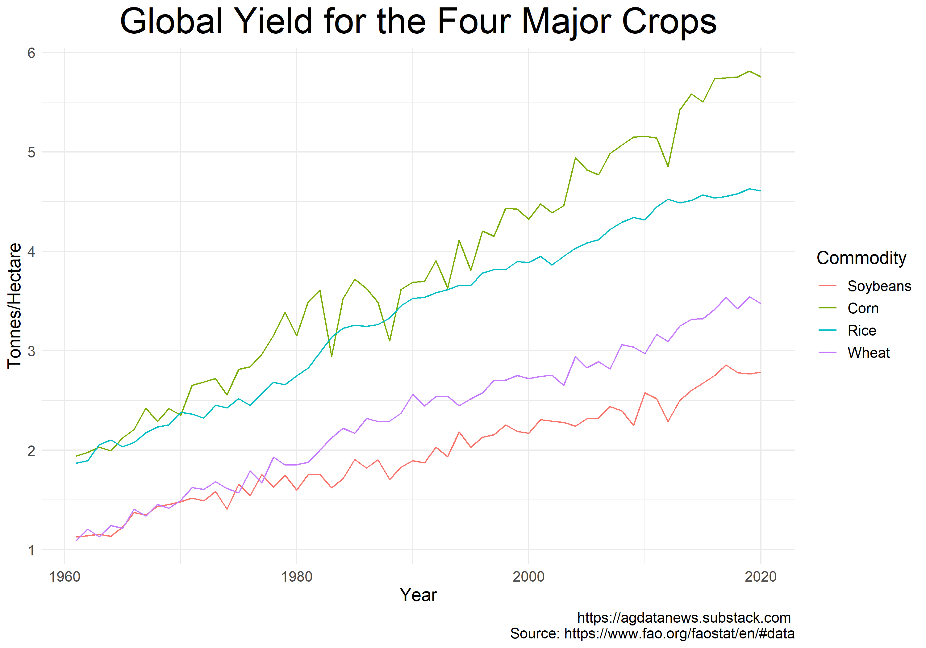 The main driver of declining prices was increasing productivity. Global production per acre (yield) of the major crops is 2.5-3.5 times higher than it was in 1960, depending on the crop. Productivity growth has slowed recently, and demand has increased due in large part to biofuels and economic growth in China. These trends, when combined with climate change which will put further pressure on yields in the coming years, imply that continuing declines in agricultural commodity prices are not guaranteed.