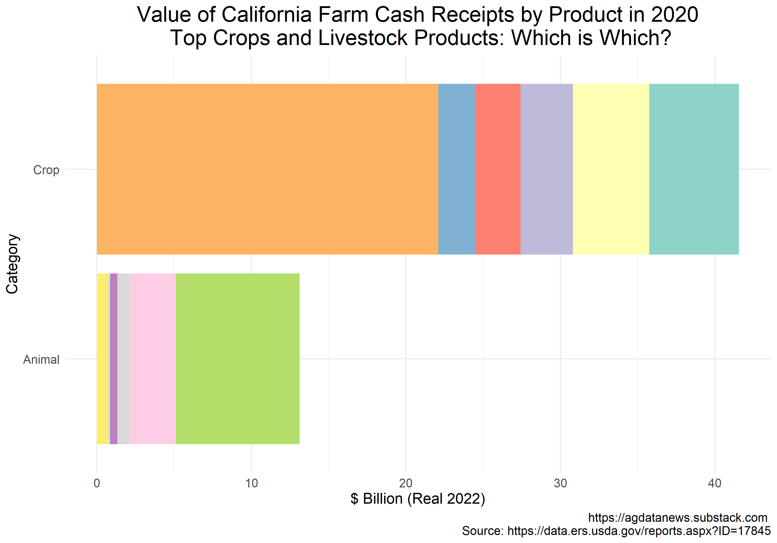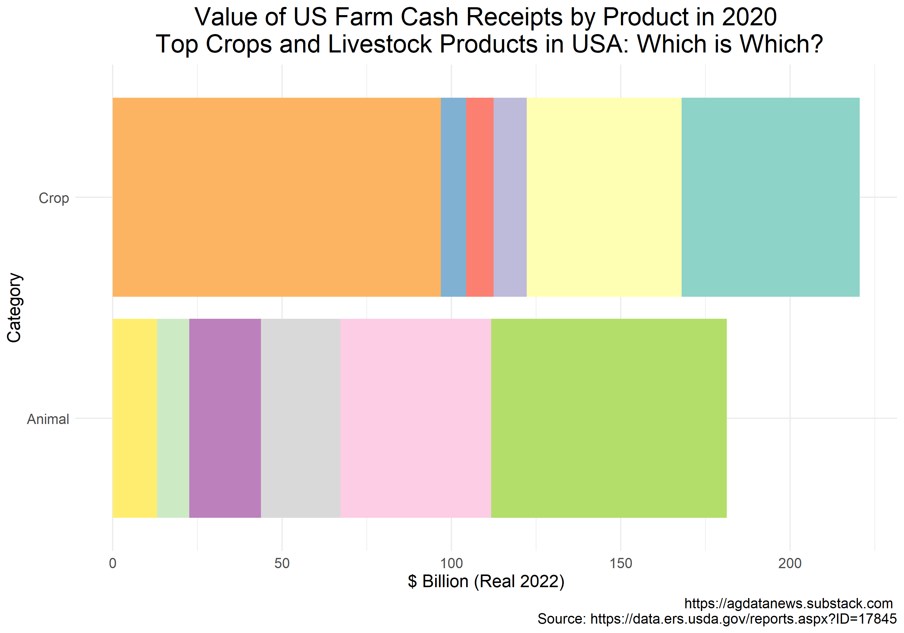 The six colors next to "Crop" in the figure below represent farm cash receipts in 2020 in the top 5 crops plus "other". The six colors next to "Animal" represent farm cash receipts in 2020 in the top 5 animal products plus "other". These data are cash receipts by farmers, which differs for some products from the value of agricultural production in FAO data (e.g., value of meat production vs receipts from sale of animals). Clue: the first color in each category is "other".