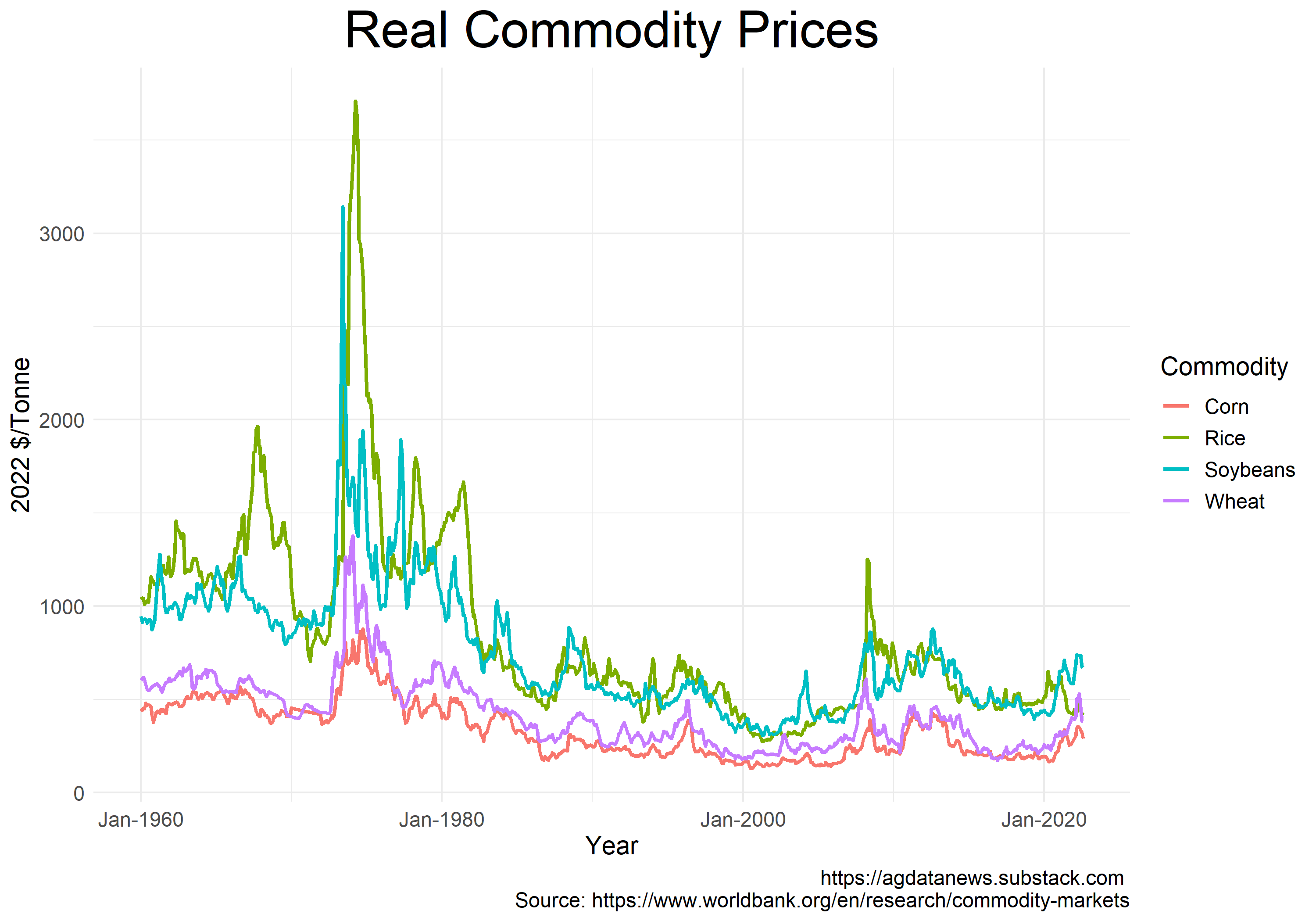 No quiz this time. I'm just going to give you the answer. Adjusted for inflation, the prices of the four biggest crops declined until around 2006. The downward trend stopped in 2006. In the ensuing years, there have been two big price booms: 2007-2013 and 2020-2022.
