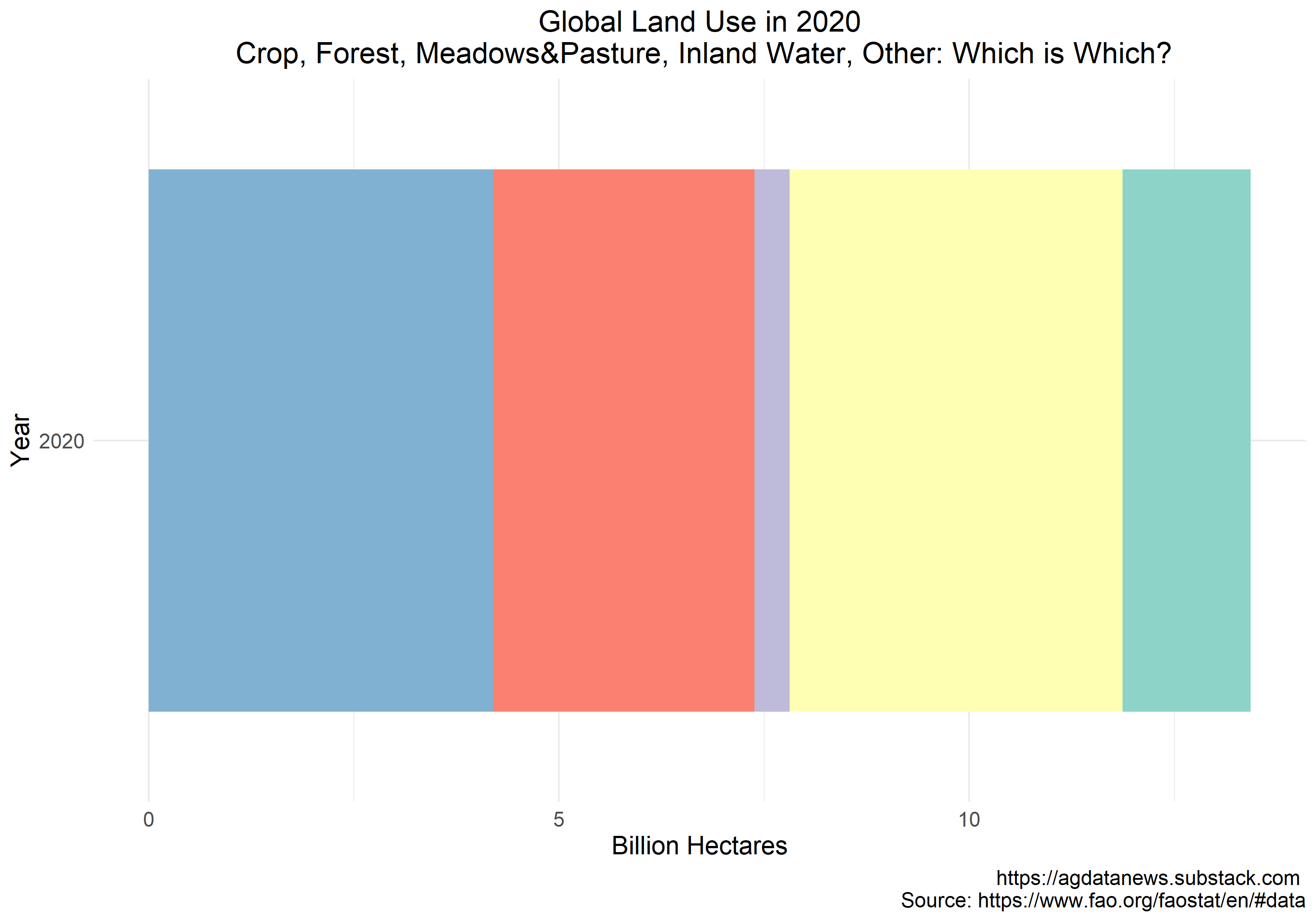 Agricultural land use falls into two categories: meadows/pastures and cropland. Meadows and pastures are used to feed animals at varying degrees of intensity. Forest covers a significant share of the world's surface, most of which is naturally regenerating. The "other" category includes deserts, urban areas, shrubland, and glaciers (mostly Antarctica).