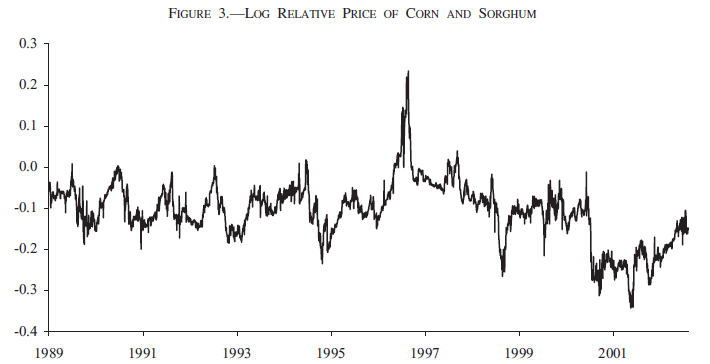 One such event occurred in 2000, when a genetically modified corn variety called StarLink that was not approved for human consumption was discovered in the food-corn supply. In a 2007 research paper, Colin Carter and I identified the resulting effect on the price of corn by showing that it drove a wedge between the prices of corn and sorghum. Sorghum has no genetically modified varieties. The graph labeled Figure 3, which is directly from our paper, shows the marked drop in the relative price in 2000.