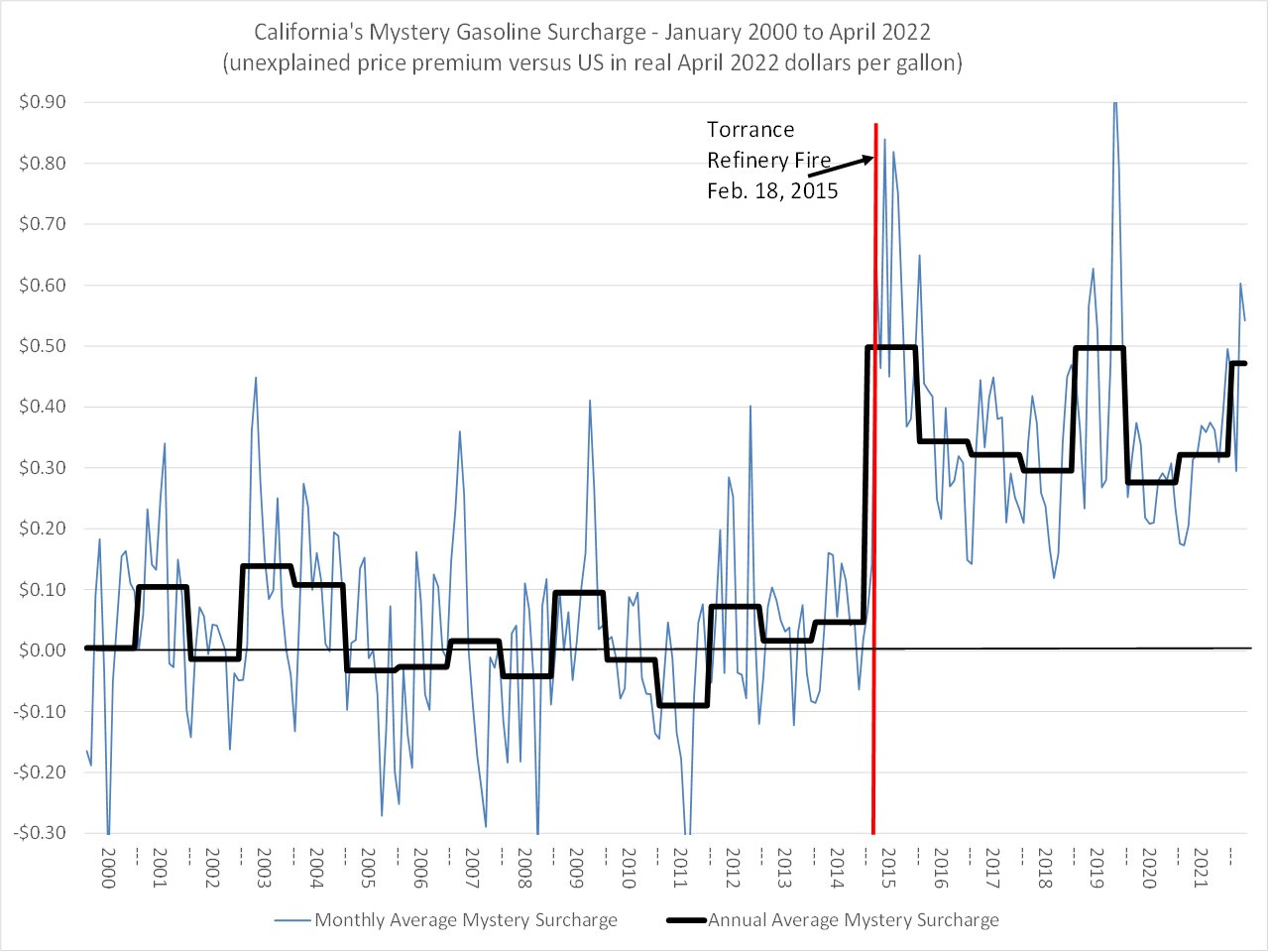 Something similar does appear to have happened in California recently. In February 2015, there was a fire at an oil refinery. Gas prices went up by $0.40 per gallon and stayed there after the refinery started back up. In the last 7 years, fuel suppliers appear to have ripped off Californians to the tune of $40b. That's $1000 per person in the state.